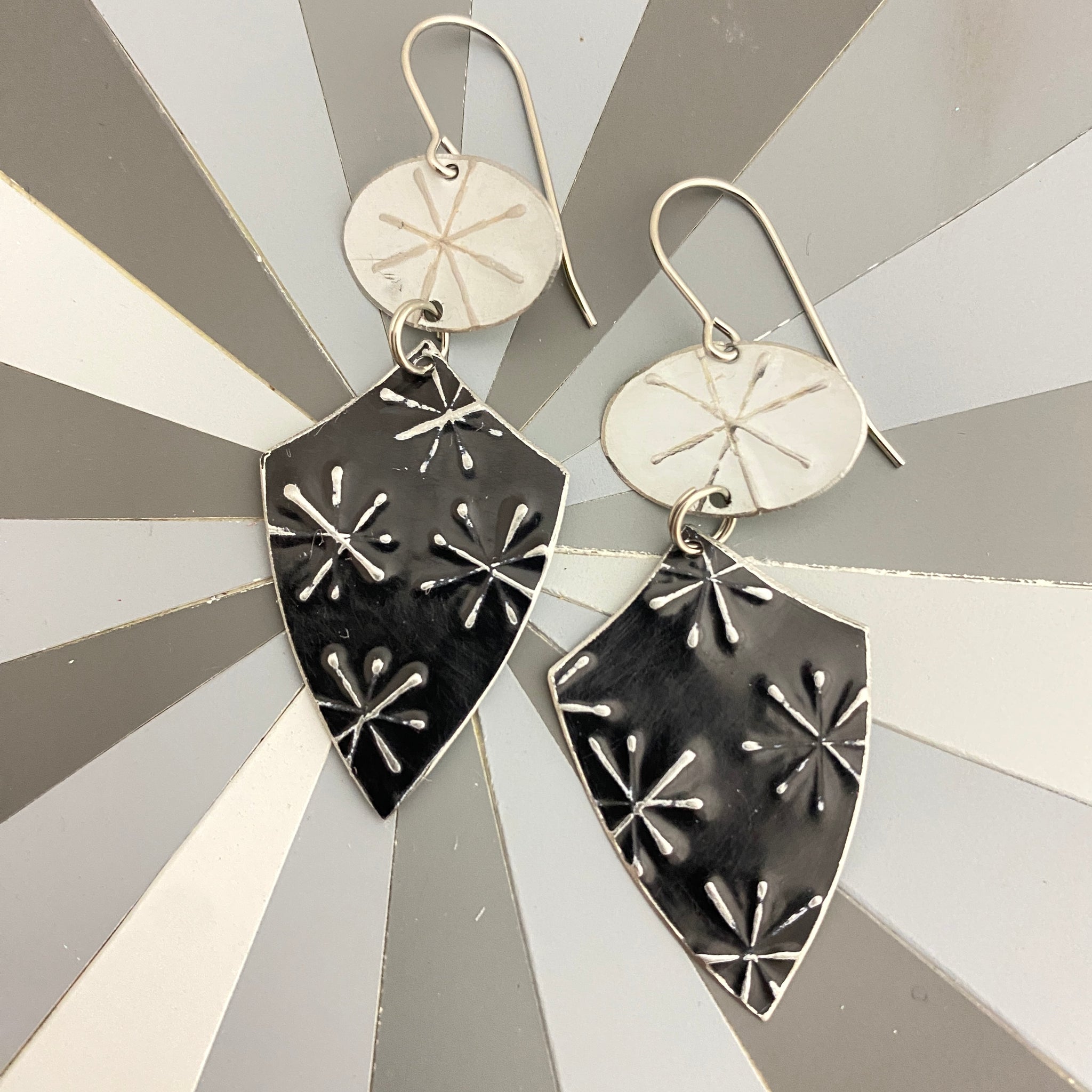 All the asterisks are hand punched on plain black and white tin. Each piece is then hand cut, edges filed and finished smooth and then connected with surgical stainless steel split rings. A surgical stainless steel ear wire finishes the look.