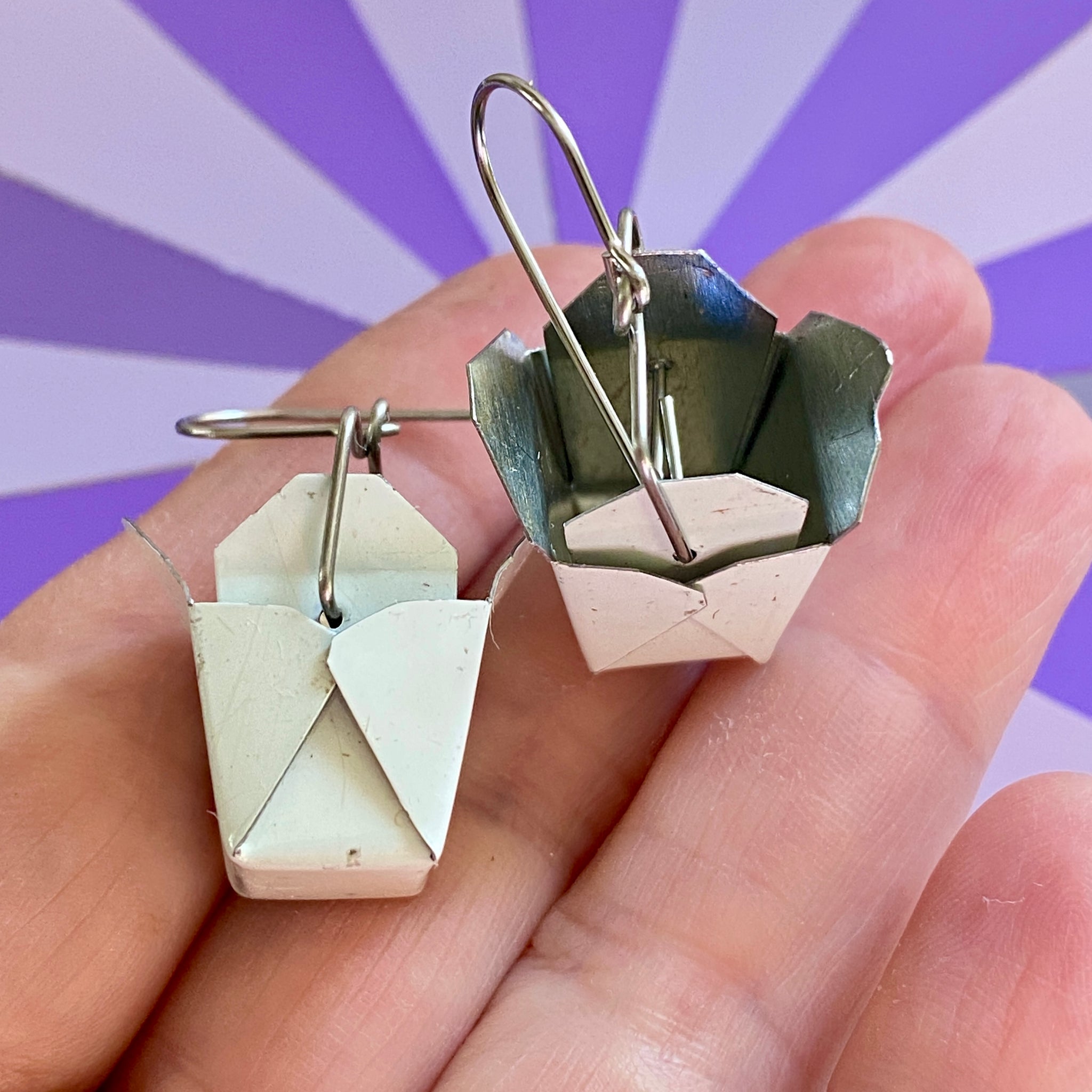 Each tiny box is hand cut, edges finished smooth and then folded into the classic to-go noodle boxes. The little wire handle is added and a surgical stainless steel ear wire finishes the look.