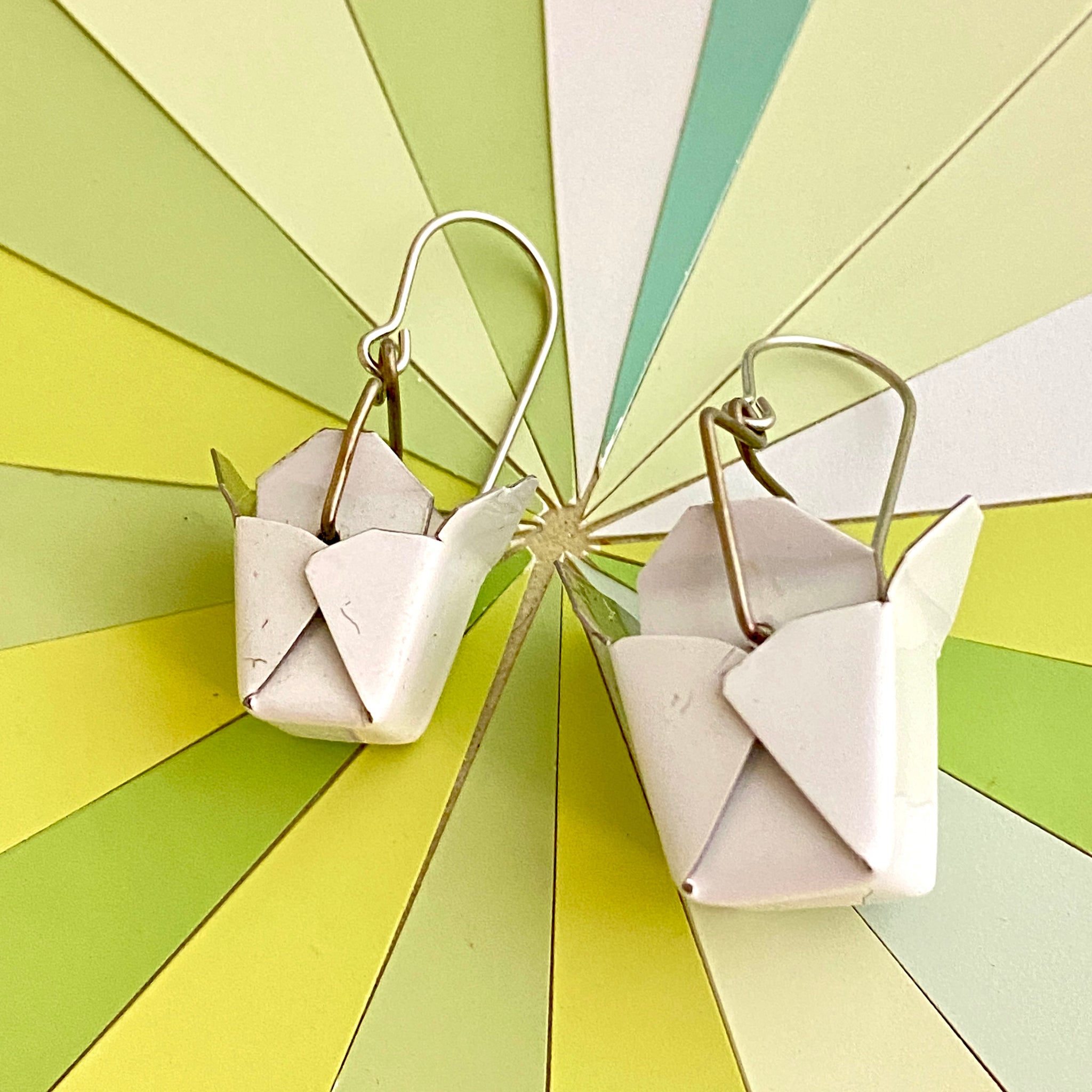 Each tiny box is hand cut, edges finished smooth and then trickily folded into the classic to-go noodle boxes. The little wire handle is added and a surgical stainless steel ear wires finish the look.