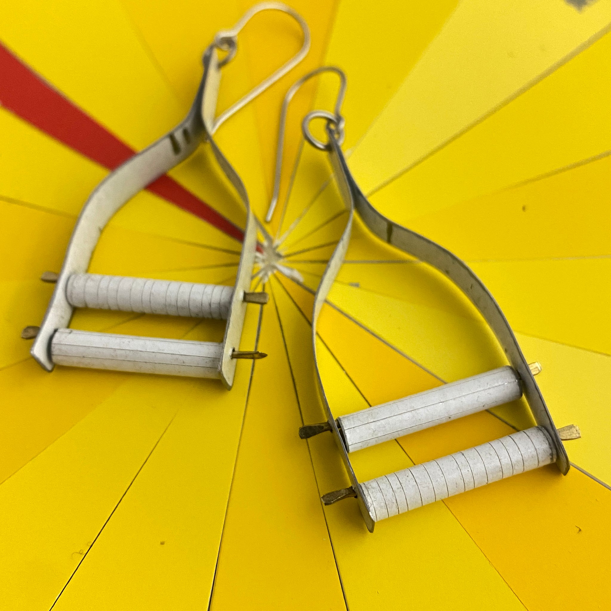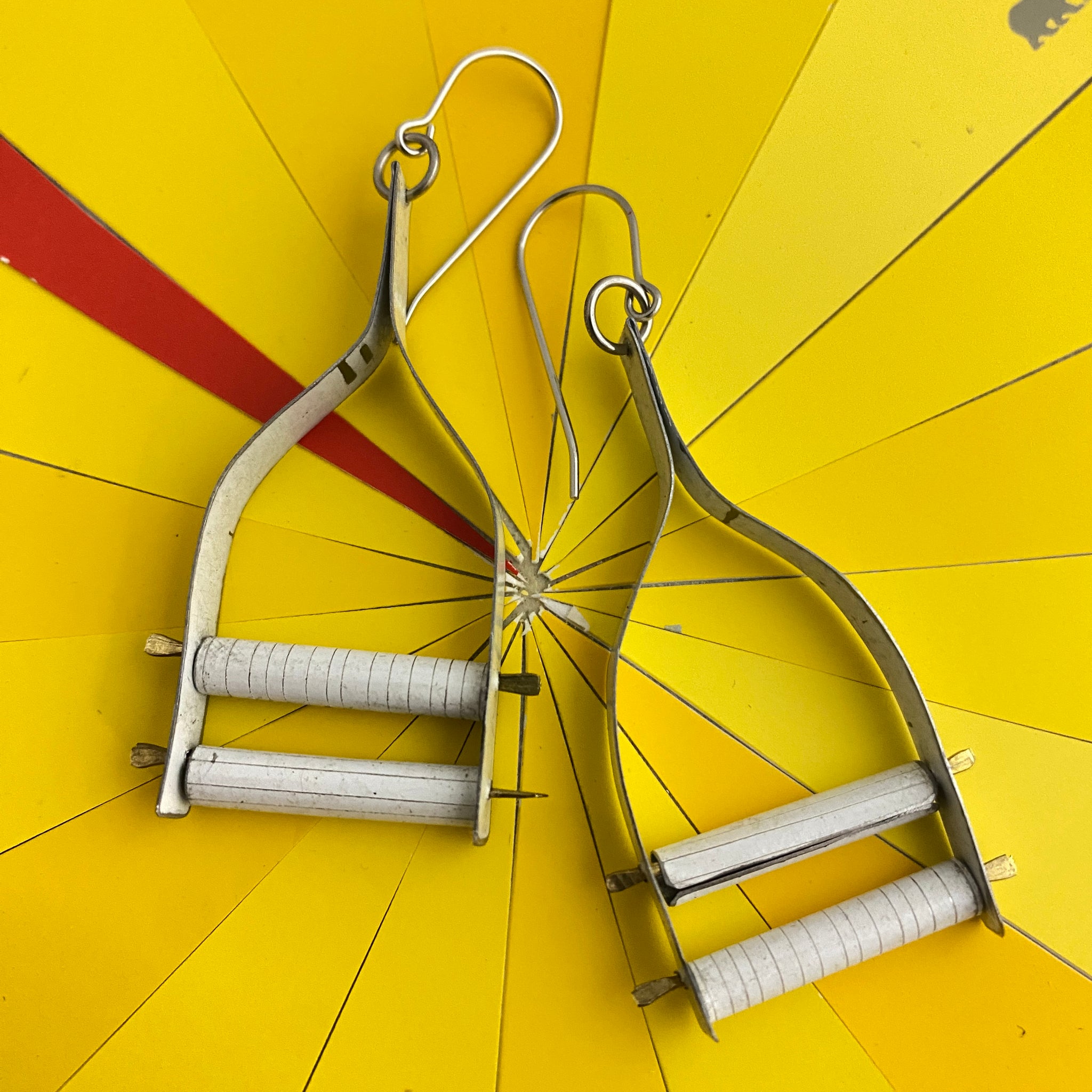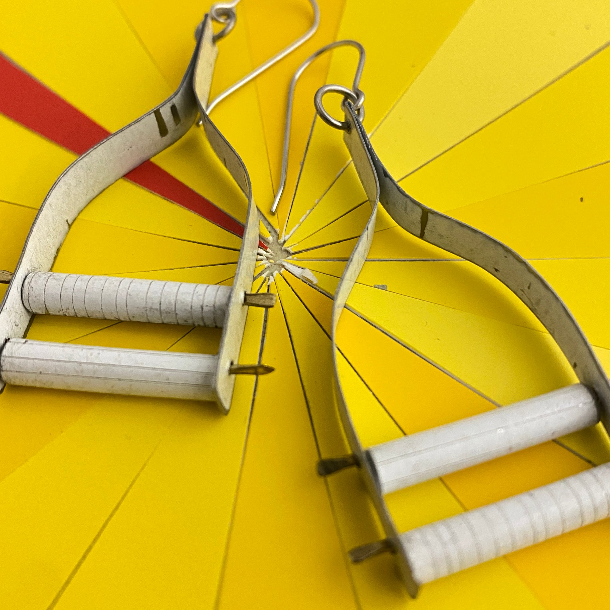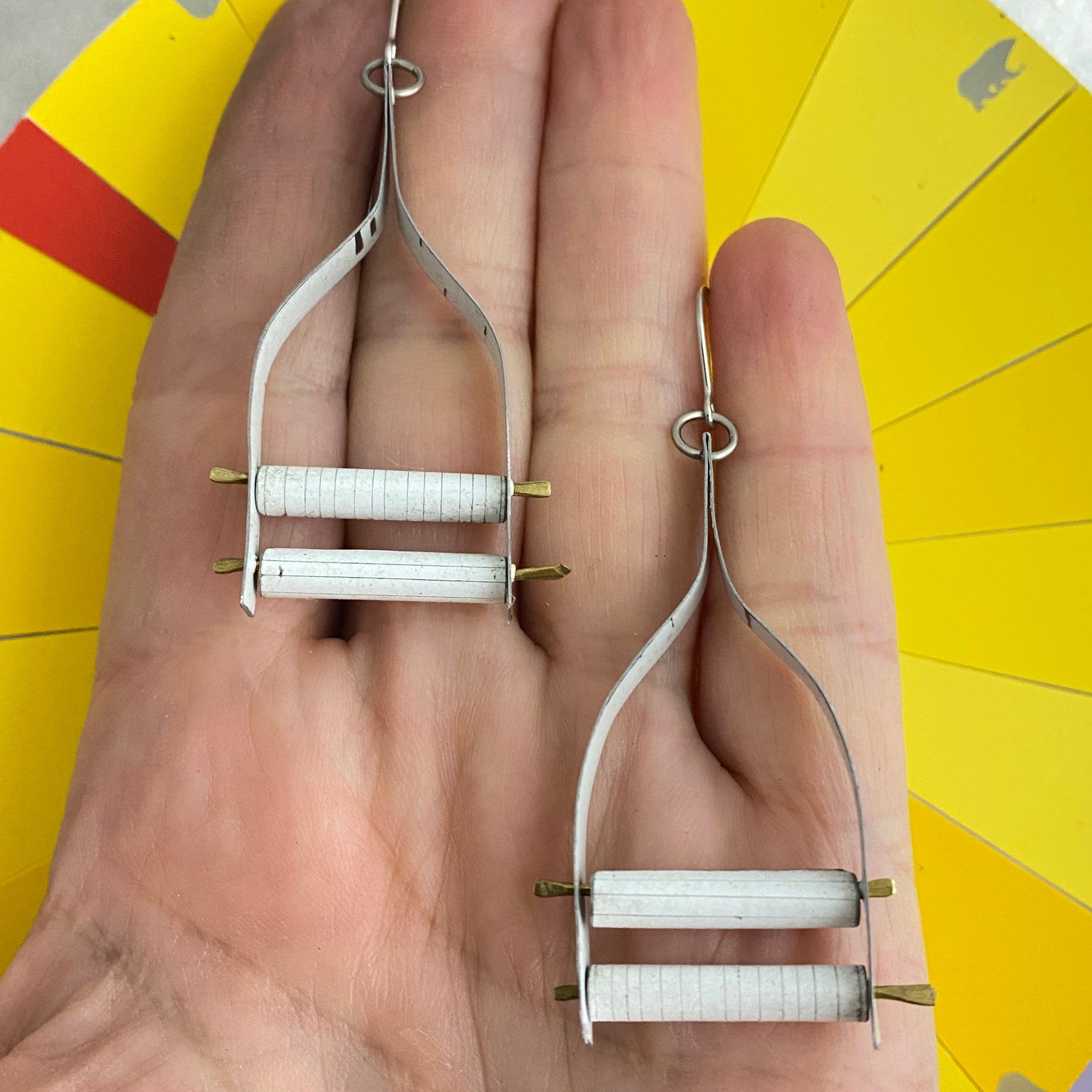A long stretch of tin is cut, filed and finished smooth, bent in half and then formed into this wishbone shape. Then I string two tin tubes between the wishbone arms and secure them with a bit of rounded wire.