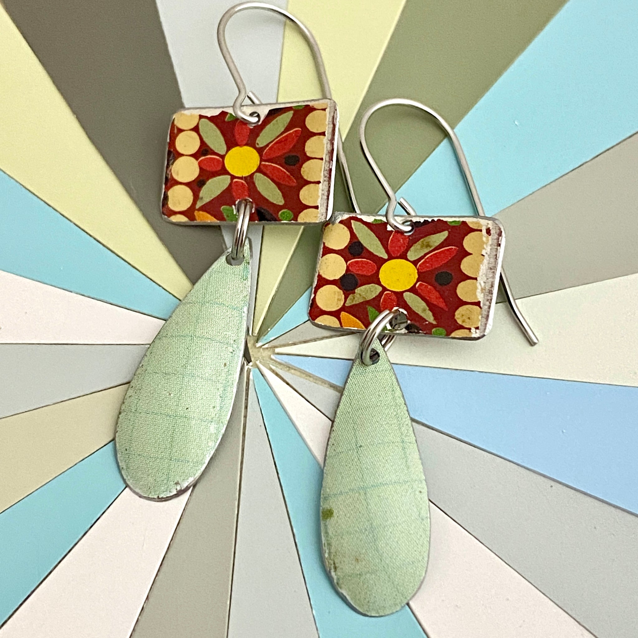 Each piece is hand cut, edges filed and finished smooth and then connected with surgical stainless steel split rings.  A surgical stainless steel ear wire finishes the look.