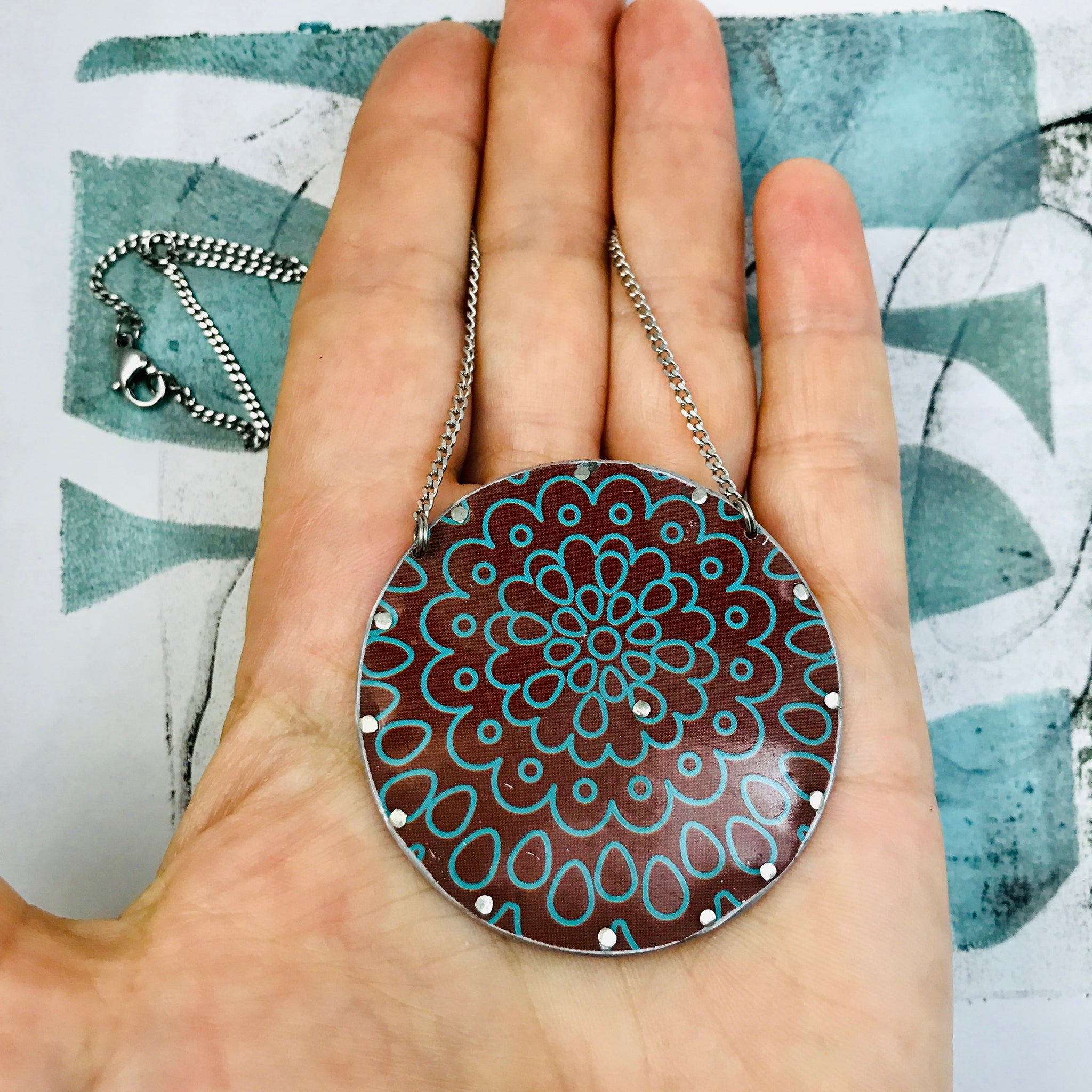 These new Color Wheel necklaces are from an idea that came to me a while back when I was making my little Chock-a-block pieces of art. I couldn’t figure out how to do the riveting for the center parts of the tin and then the other day it finally occurred to me to just use a little circle to hold the tin triangles in place. Im pretty excited about having yet another way to use up the scrippy scraps of tin!