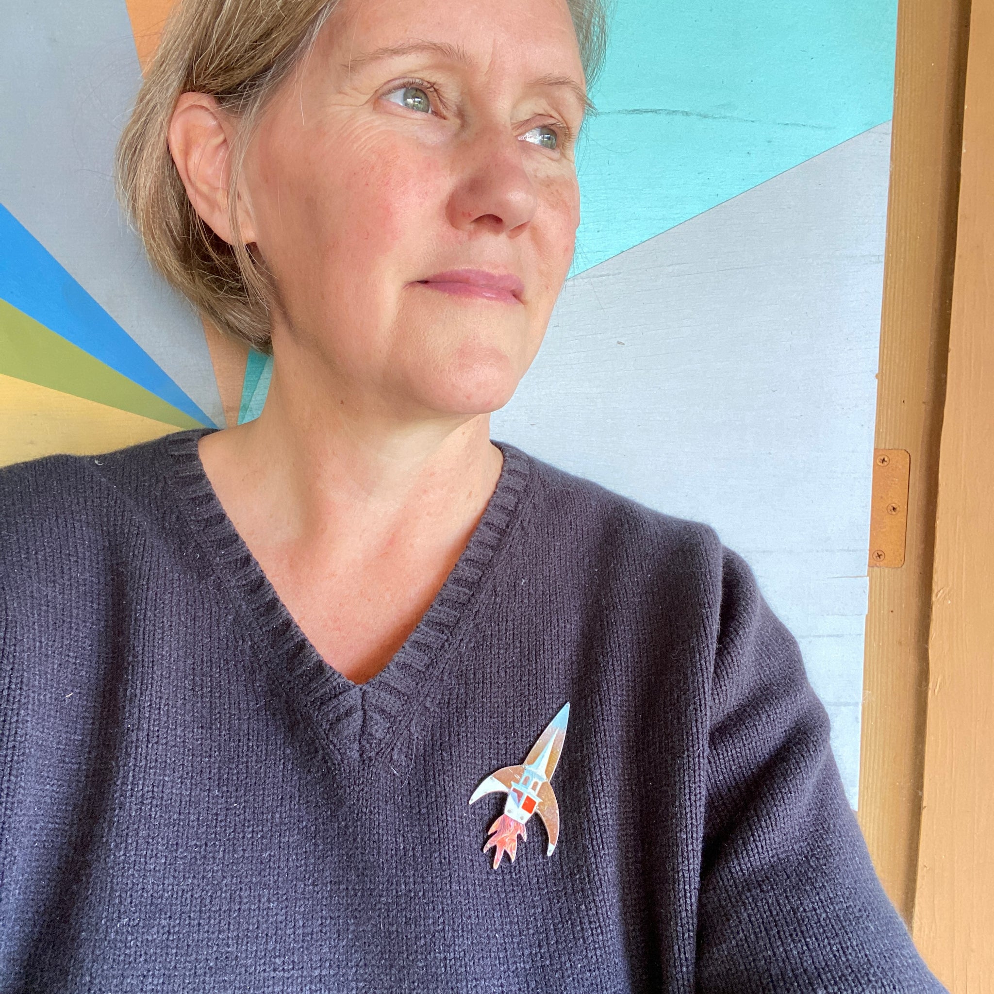 Each piece is hand cut, edges filed and finished smooth, and riveted to an upcycled piece of Formica. A strong rare earth magnet is adhered to the back and another disc magnet allows you to attach the pin without putting holes in the fabric.