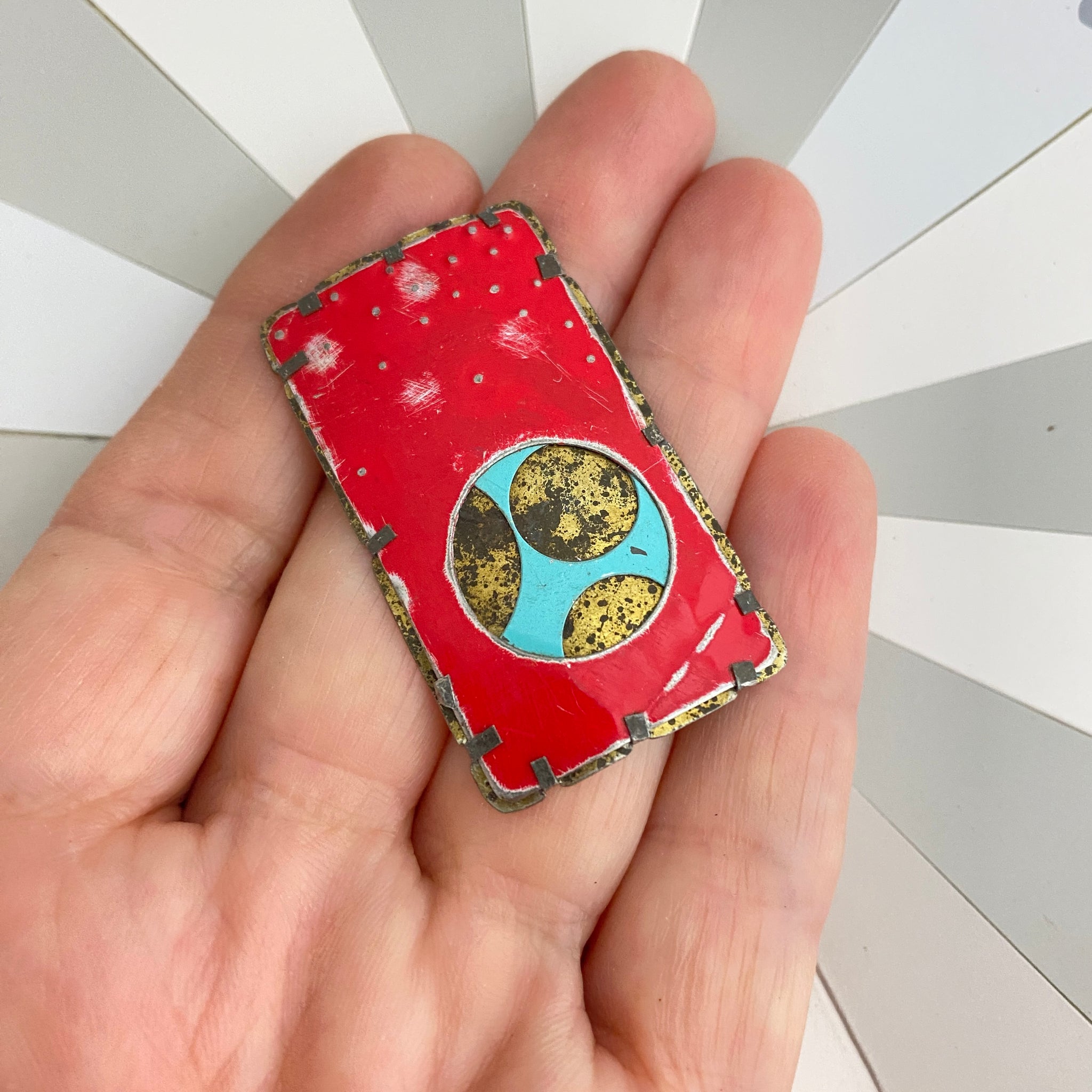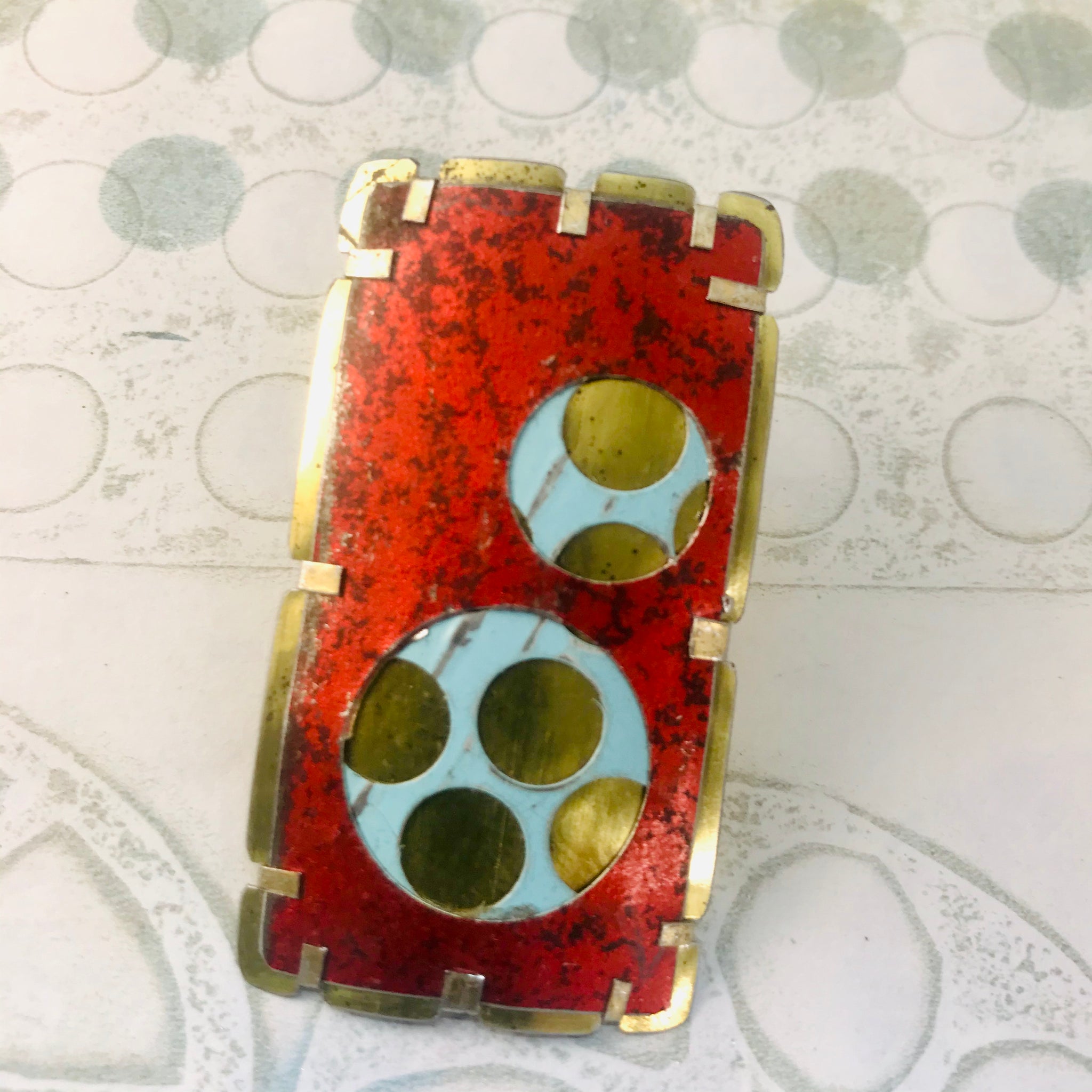 This piece features a beautiful stretch of bright red over a bit of light aqua remainders. They both sit on top of a weathered antique gold tin bottom I almost relegated to recycling. Glad I held on to it