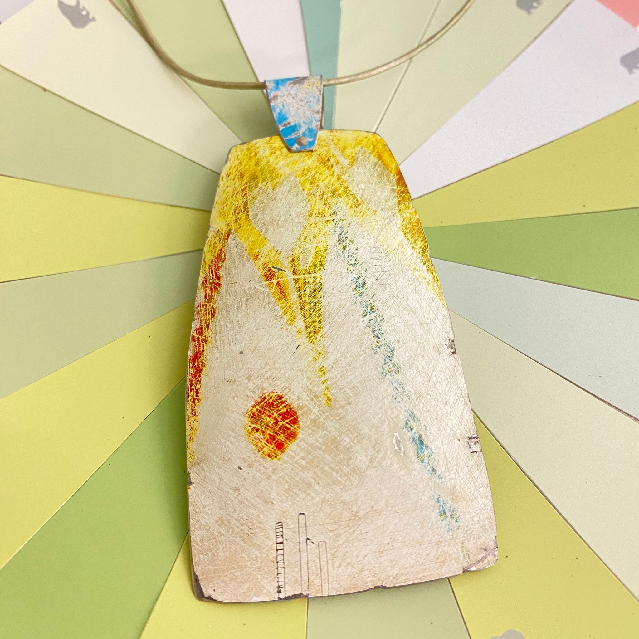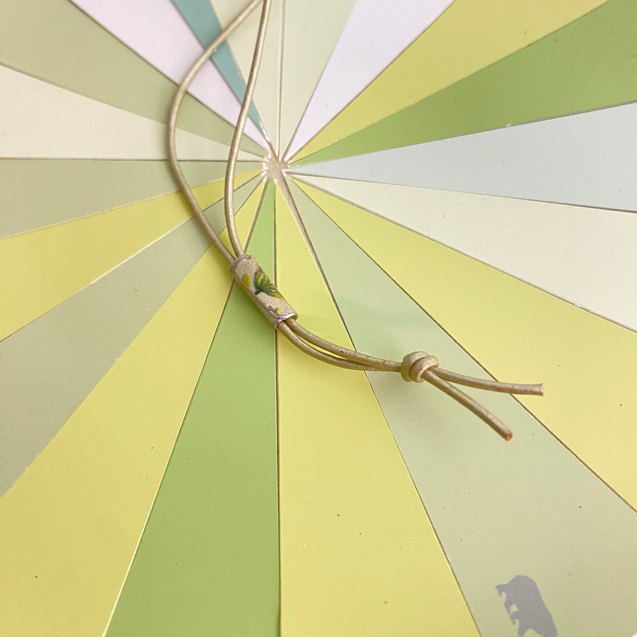 The pendant is strung on a 2mm 35” long lEsther cord with an adjustable sliding clasp.
