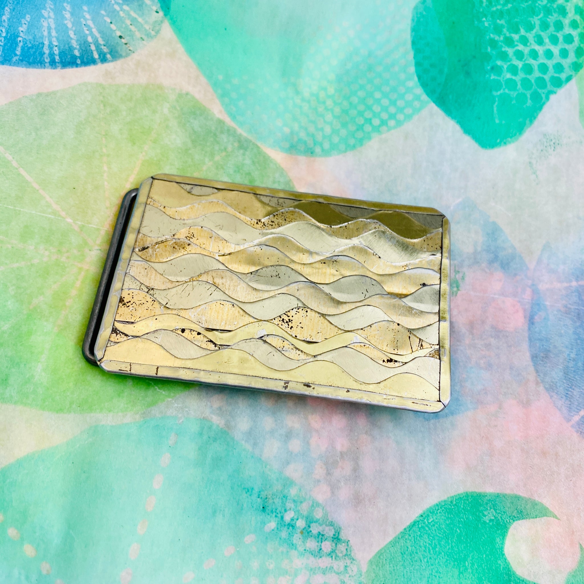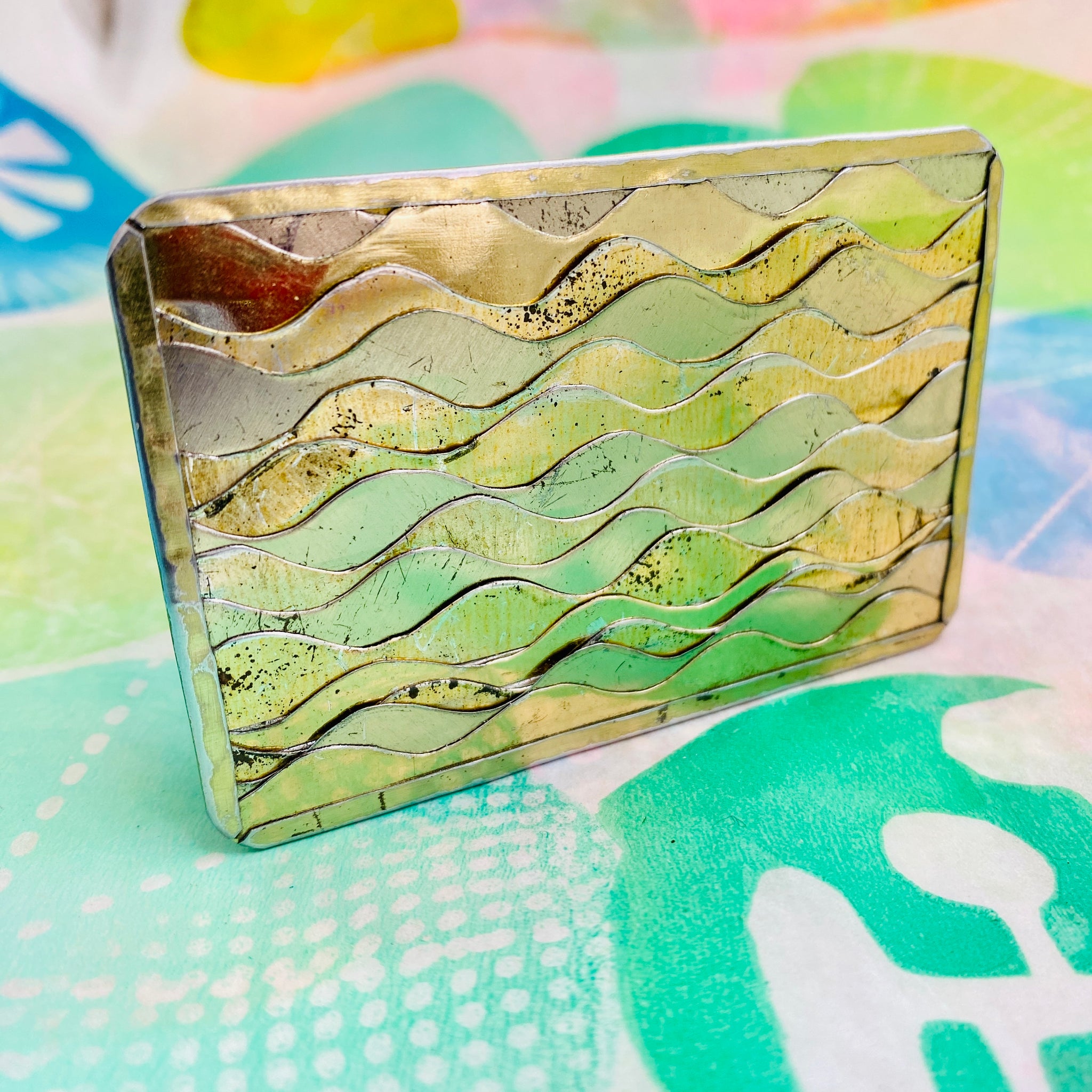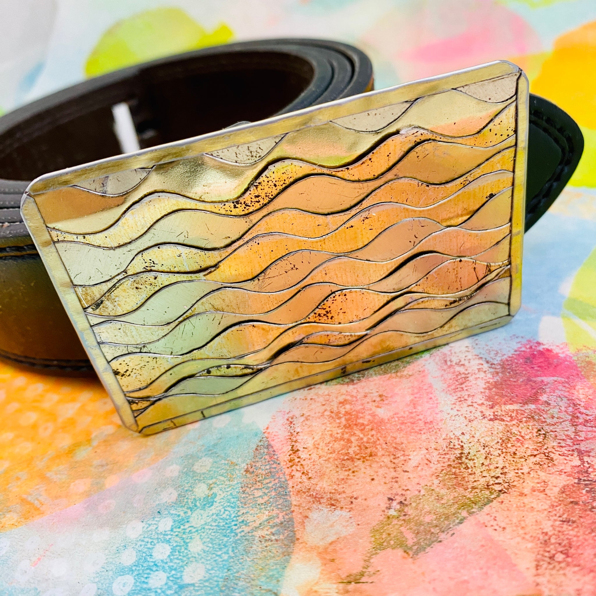 Each wavy length of golden tin is hand cut and layered over each other. The full composition is placed on top of another rectangle of tin that has been attached to a solid steel buckle blank. The outside edges are then carefully folded up to crimp all the tiny pieces in place. The final step is to distress the outer edges to match the look and feel of the interior.