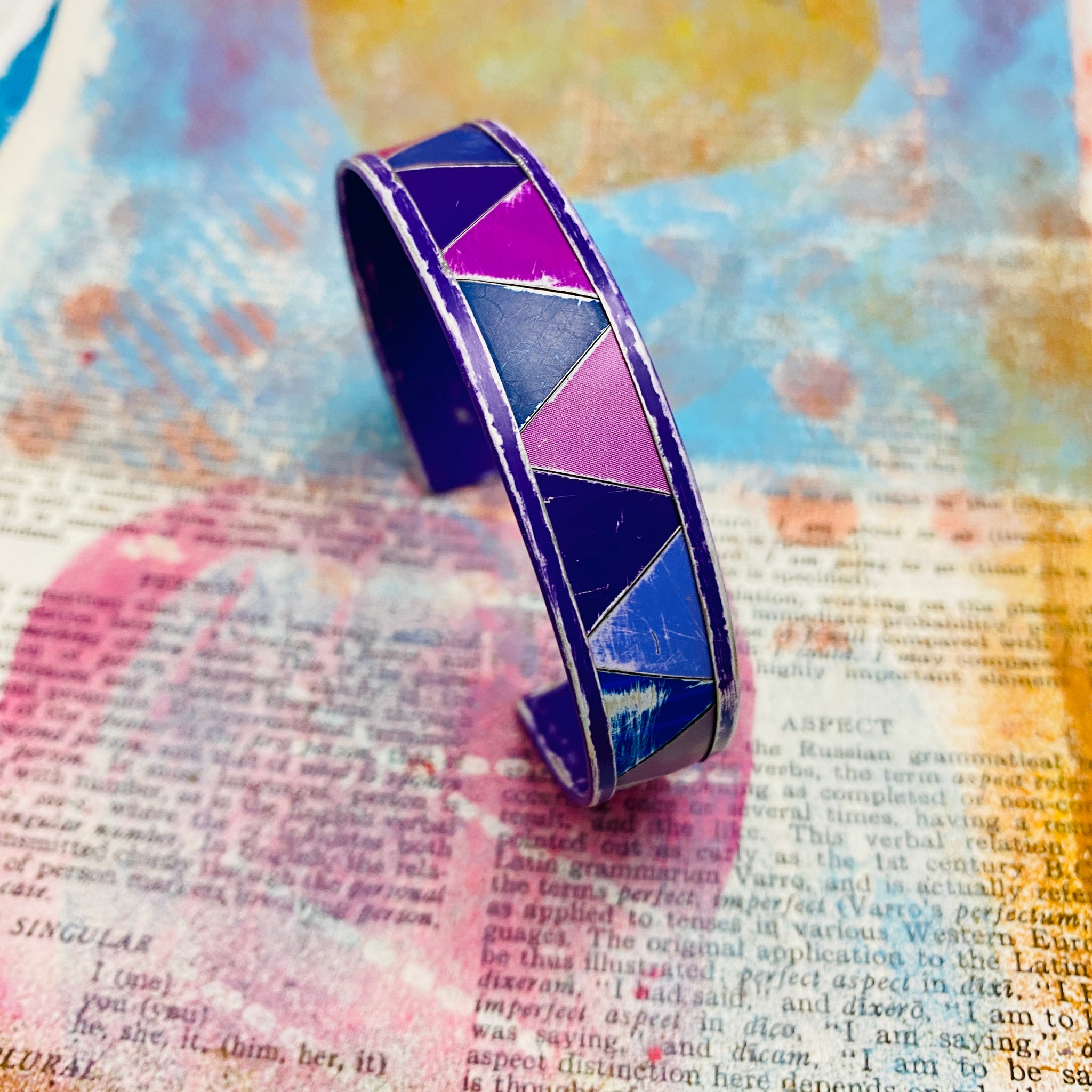 Each triangle of tin is hand cut, distressed and added to the line. Once the full run of color is decided, the line of triangles is placed on top of a wider strip of tin from a vintage doll house and the edges are carefully folded up to crimp all the pieces in place.