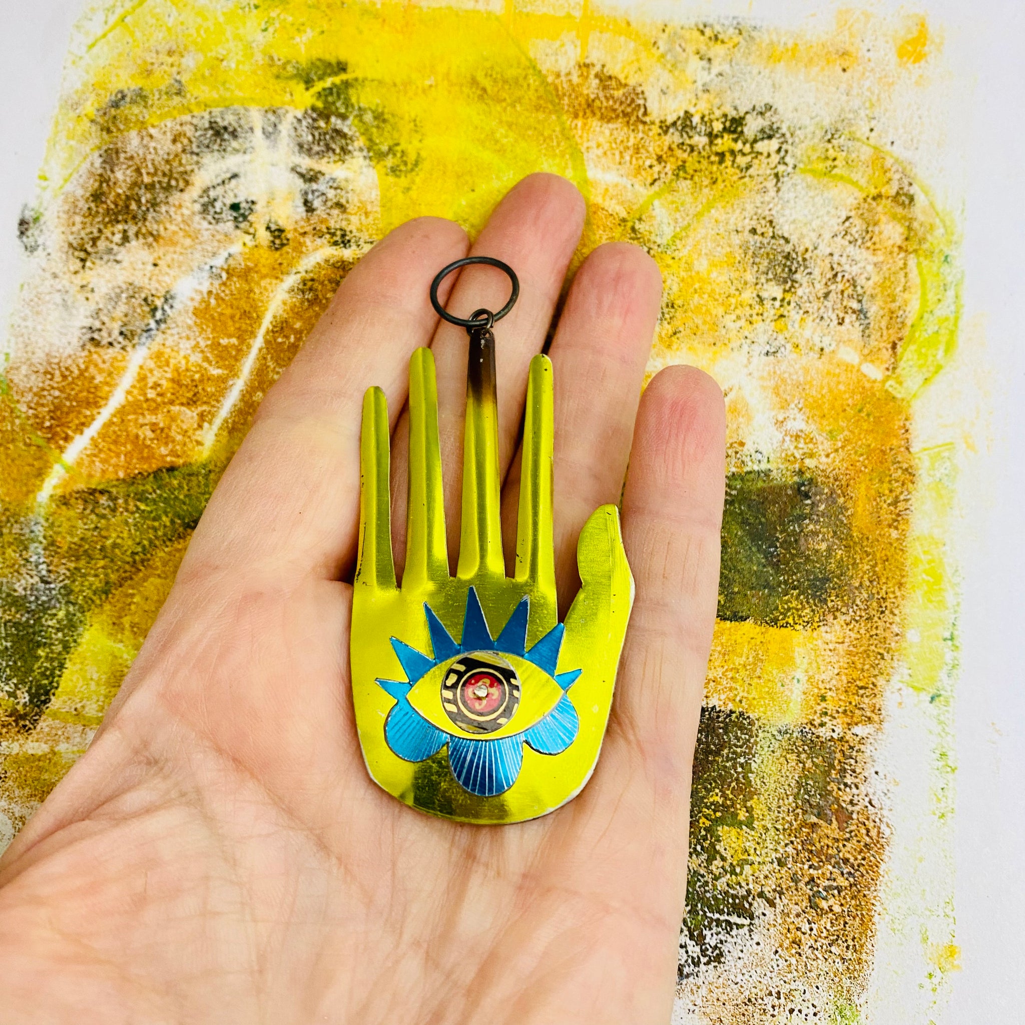 This piece can be worn as a pendant or hung as a piece of wall art. As a pendant the hamsa is strung on a gunmetal finish 16” figaro chain or a .5" waxed steel ring for the wall art. Choose your preference from the drop down menu.