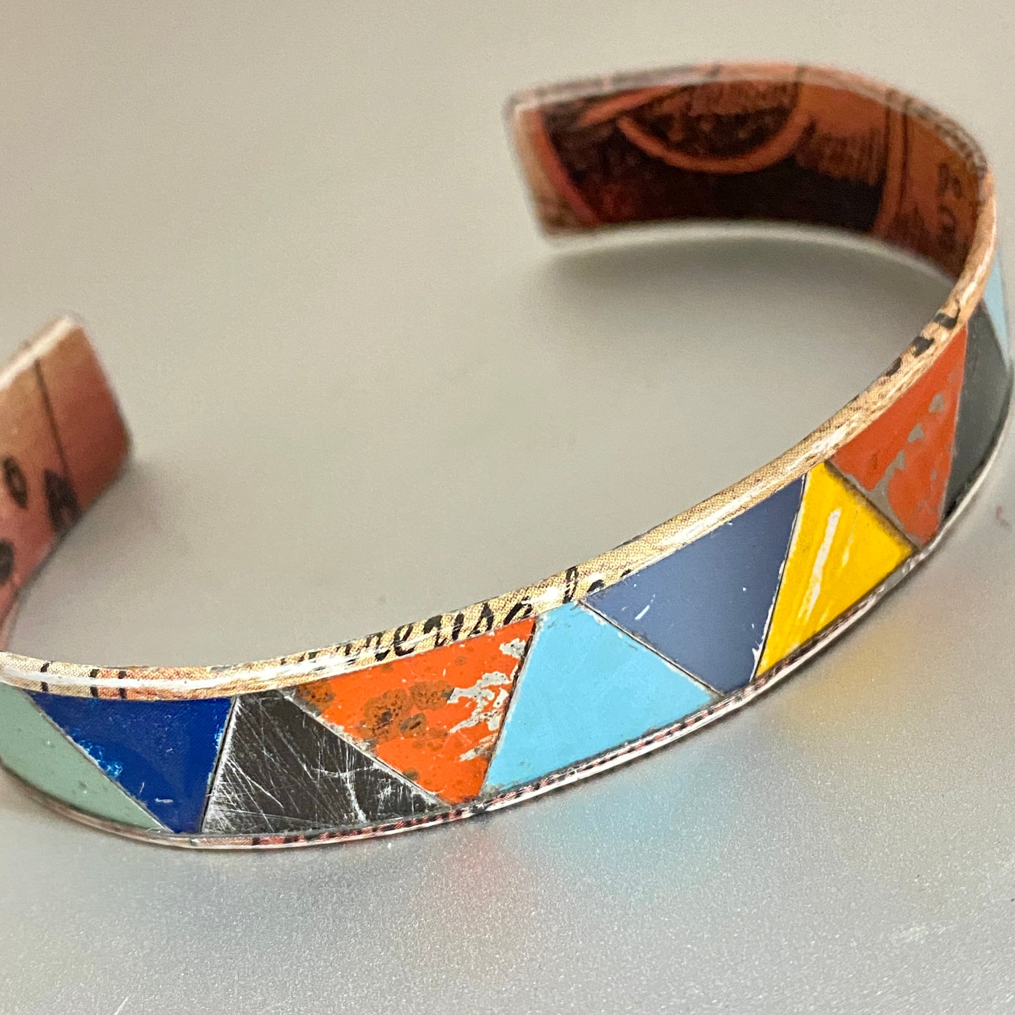 Each triangle of tin is hand cut, distressed and added to the line. Once the full run of color is decided, the line of triangles is placed on top of a wider strip of tin from a vintage doll house and the edges are carefully folded up to crimp all the pieces in place.