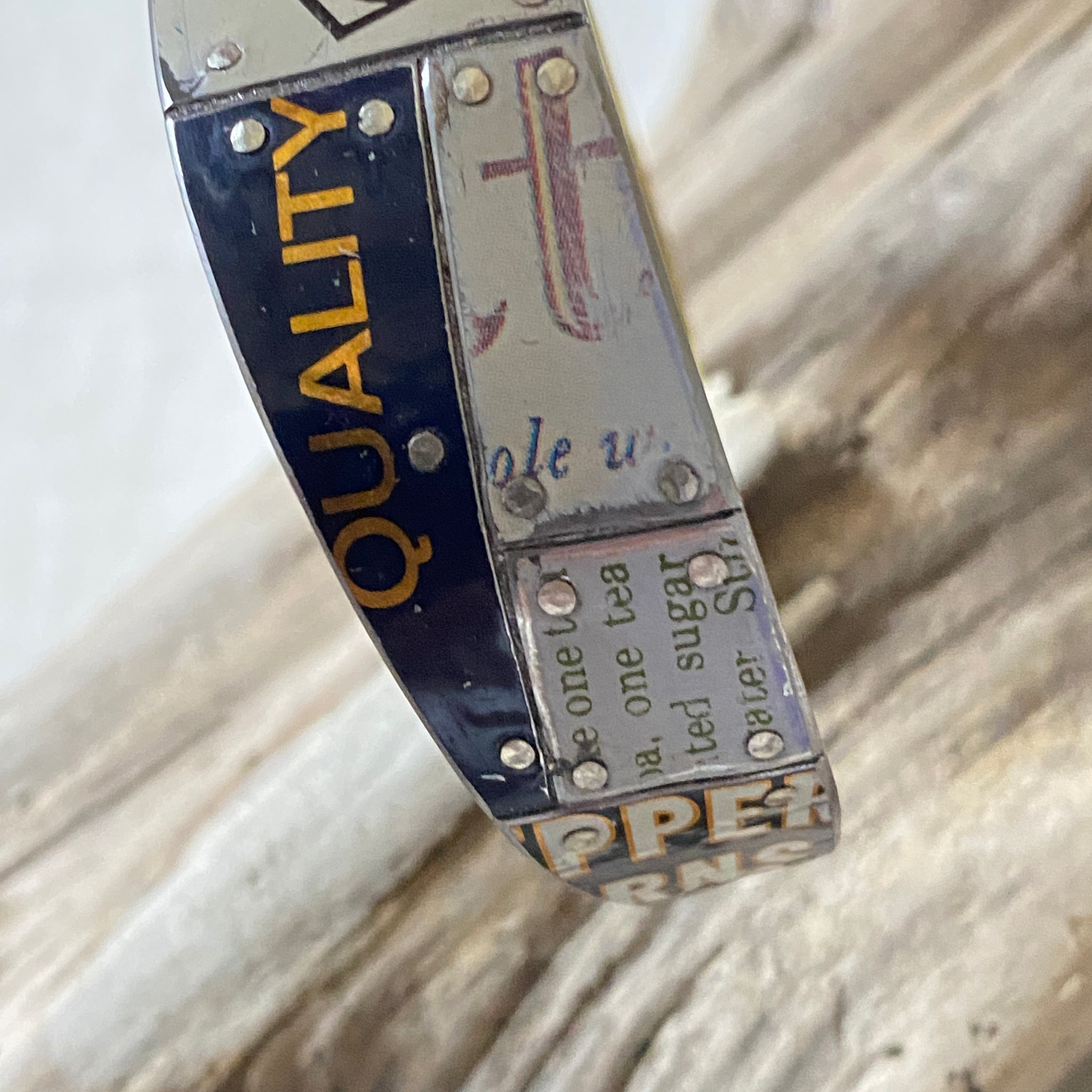 I’ve been drawn to working with some of the bits of typography that I’ve collected over time. These little mosaic cuffs feature a range of tin I don’t always use in my work.