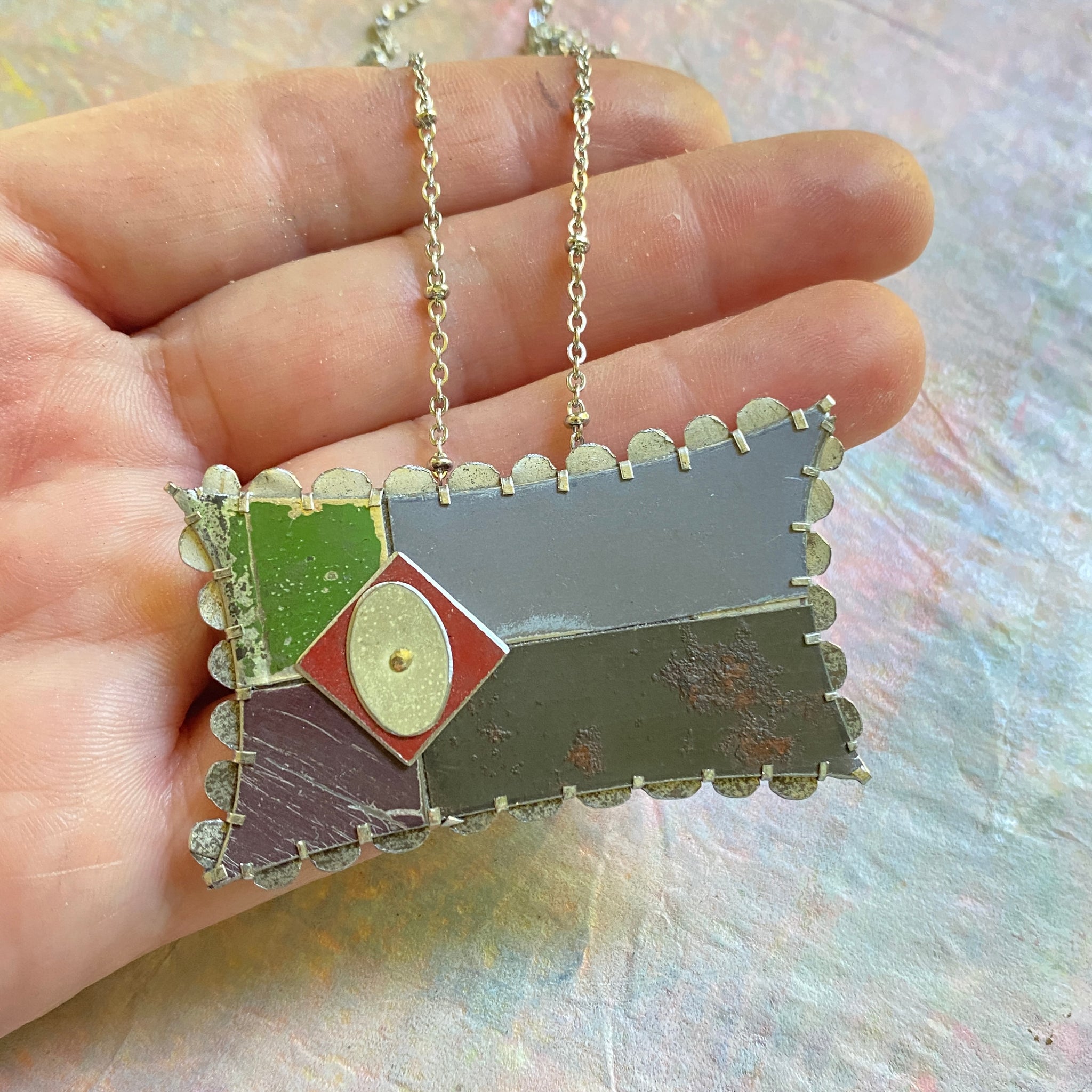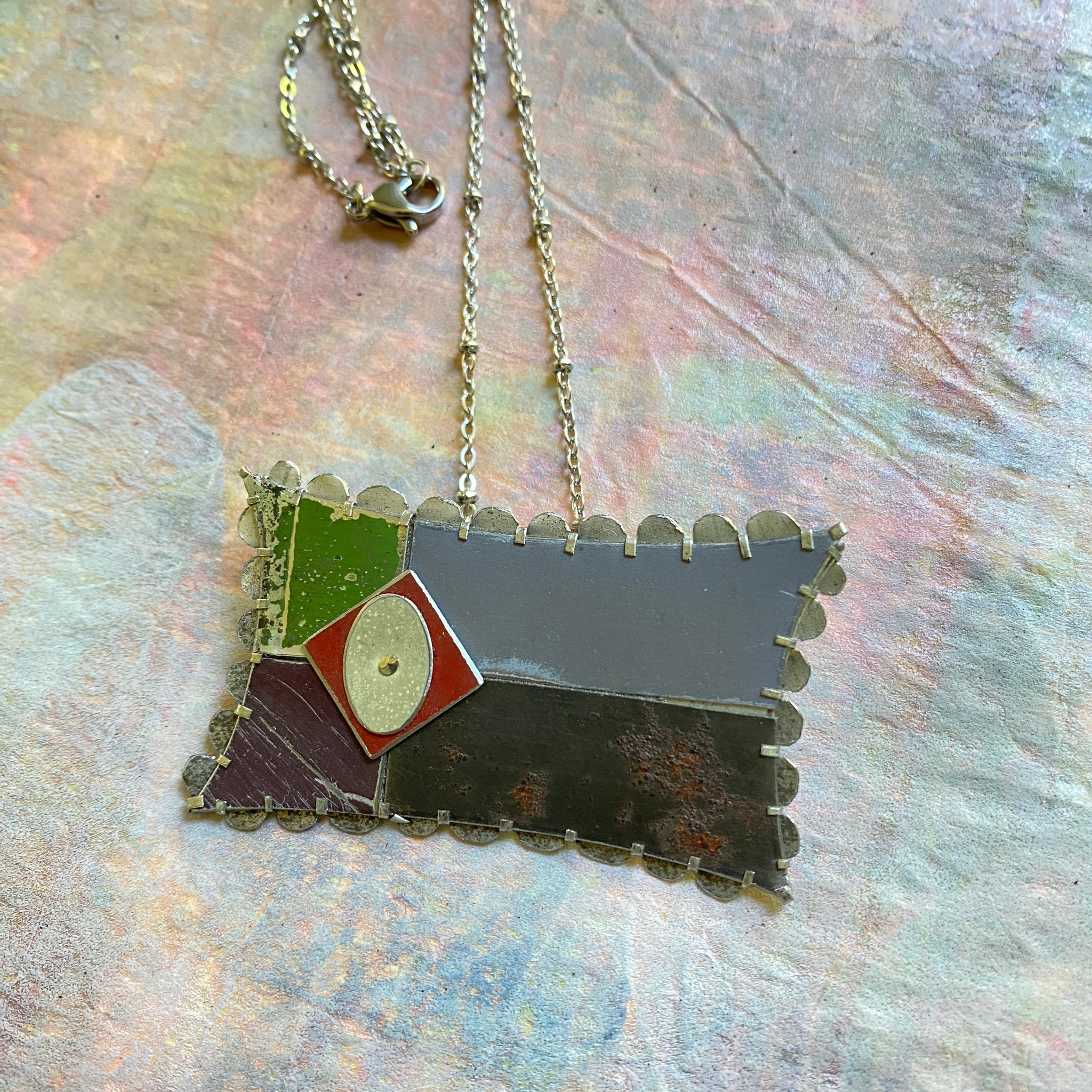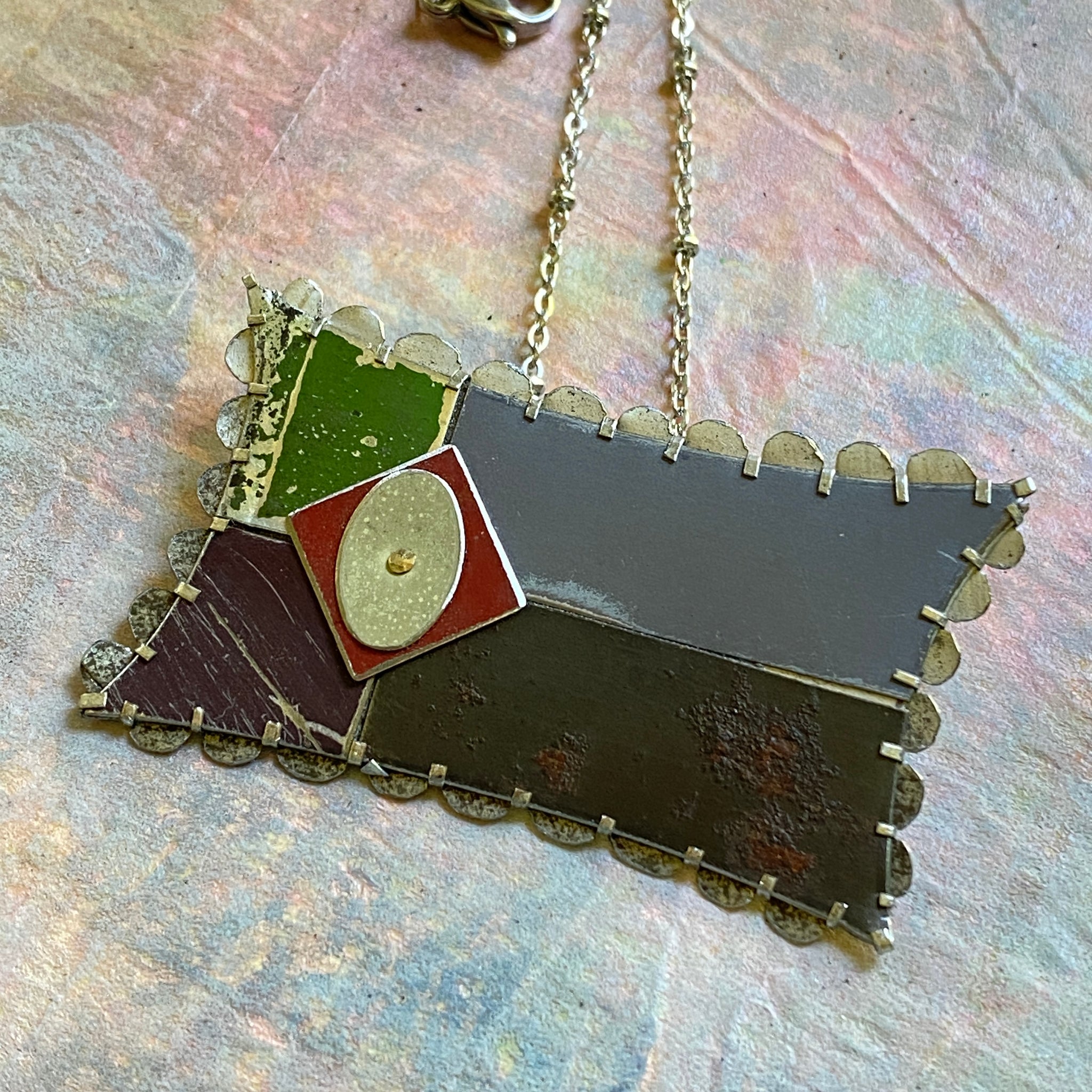 Each piece is hand cut, edges filed and finished smooth, riveted and tabbed to a piece of backing tin. The backing tin is then shaped into the scalloped edge and a 18” silver finish chain finishes the look.