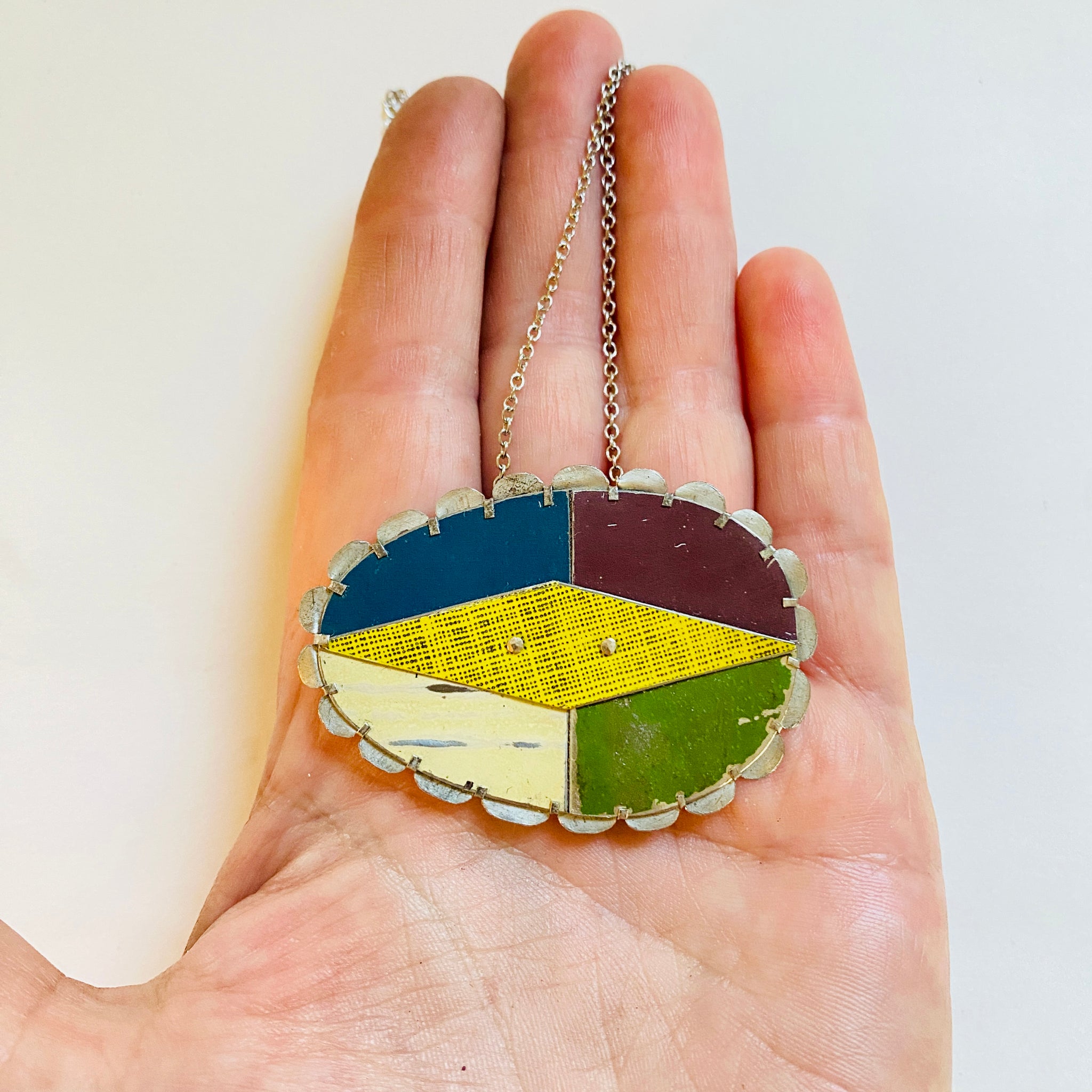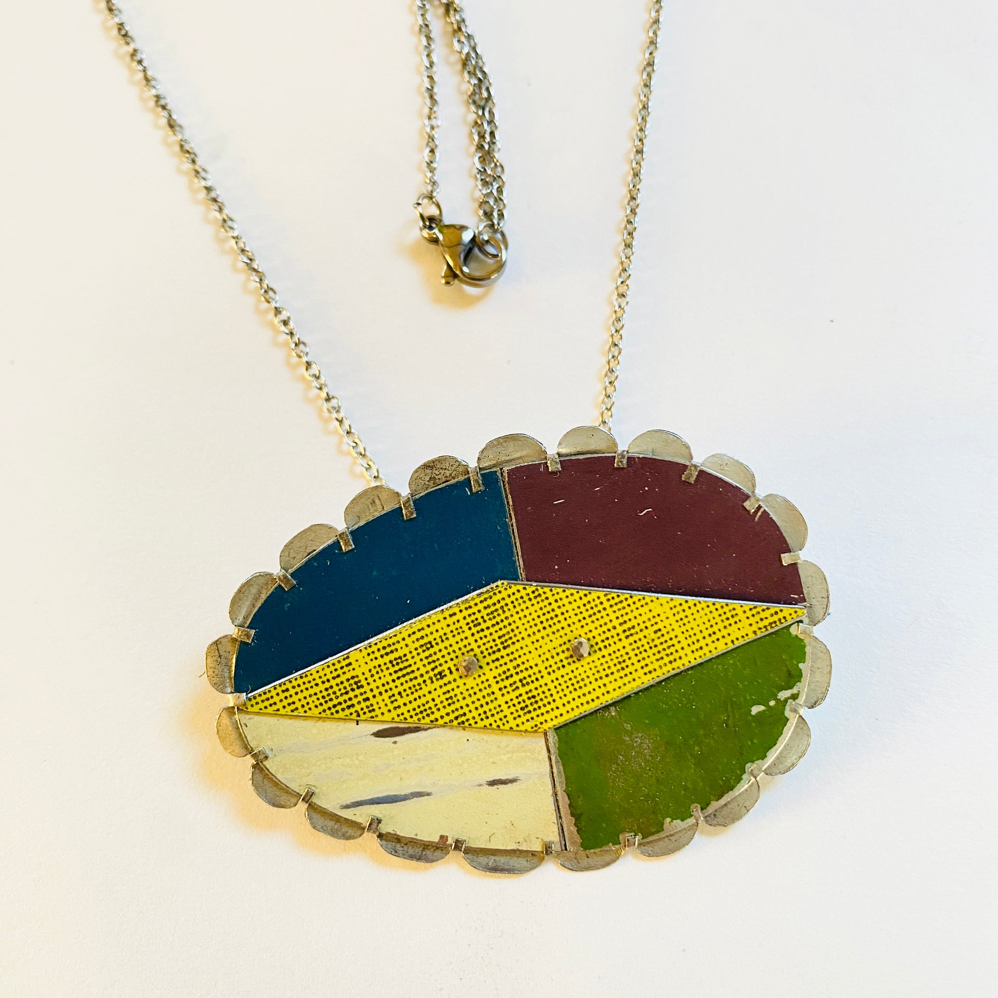 Each piece is hand cut, edges filed and finished smooth, riveted and tabbed to a piece of backing tin. The backing tin is then shaped into the scalloped edge frame. The backing tin is then shaped into the scalloped edge frame and an 18” silver finish chain finishes the look.