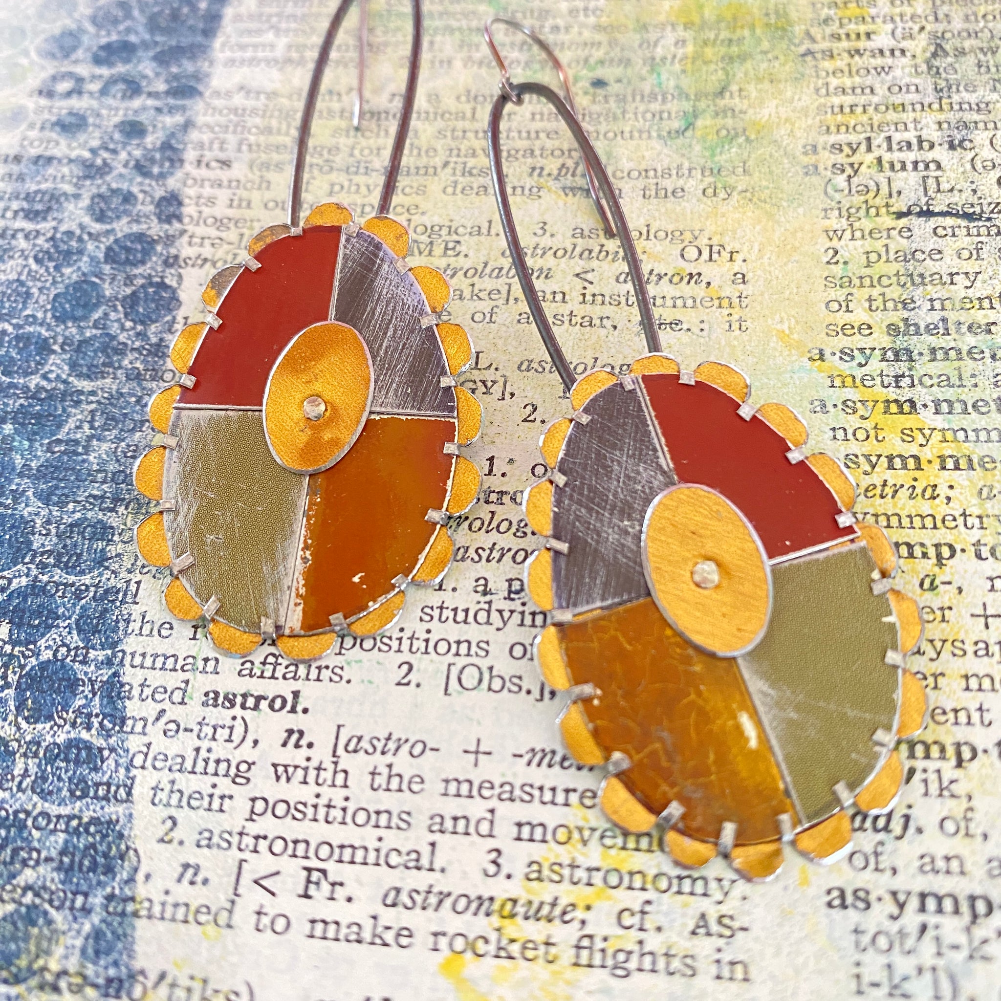 Each piece is hand cut, edges filed and finished smooth, riveted and tabbed to a piece of backing tin. The backing tin is then shaped into the scalloped edge frame. The final construction is riveted to a length of waxed steel wire and surgical stainless steel ear wire finishes the look.