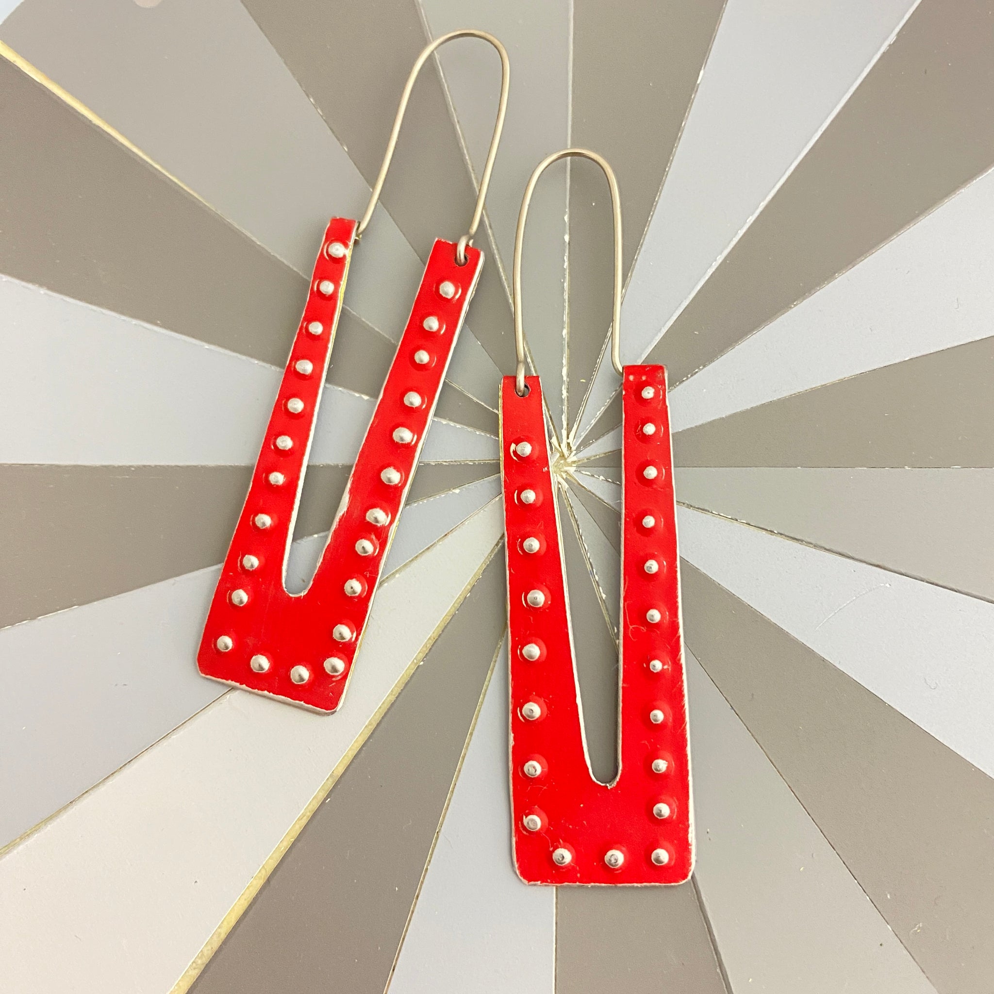 Each piece is hand cut, edges filed and finished smooth. The piece is folded in half, dimpled, given a matte finish and then a surgical stainless steel ear wire finishes the look.