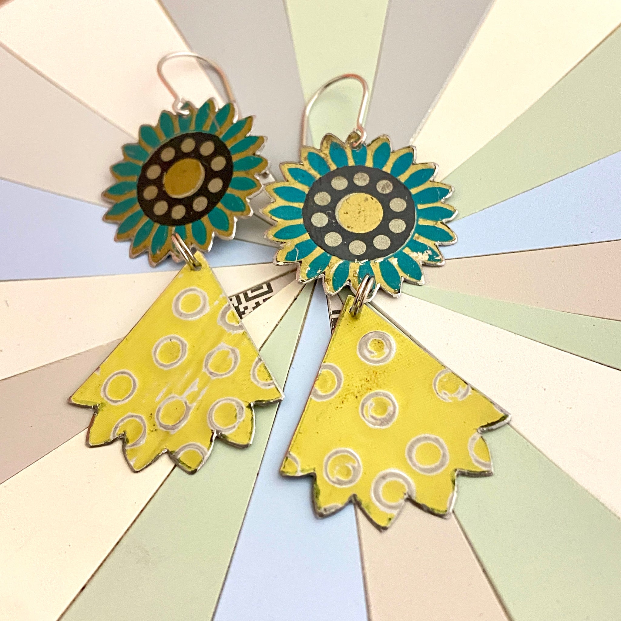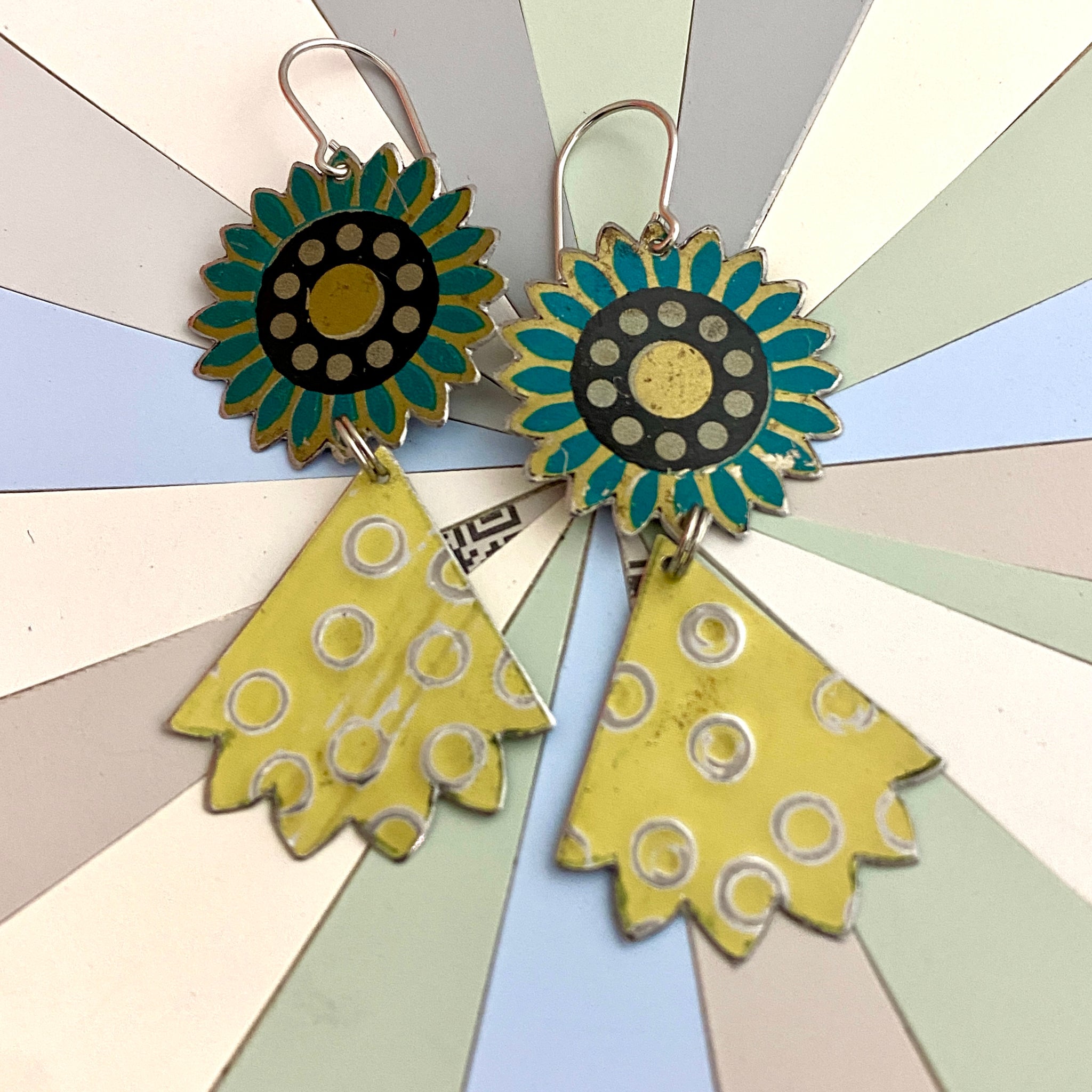 Each piece is hand cut, edges filed and finished smooth. The buttery yellow pieces are hand patterned and given a matte finish. Pieces are connected with surgical stainless steel split rings. A surgical stainless steel ear wire finishes the look.