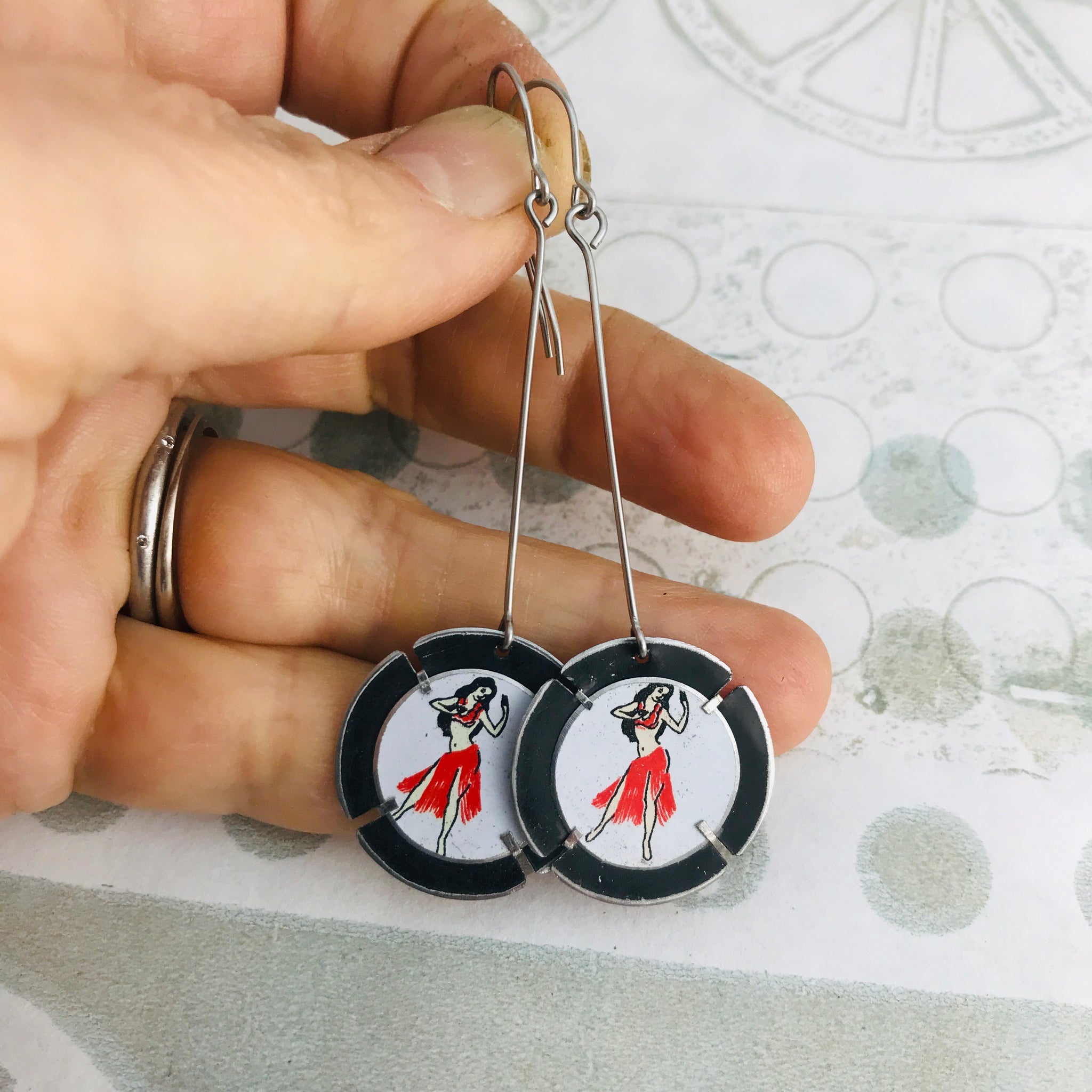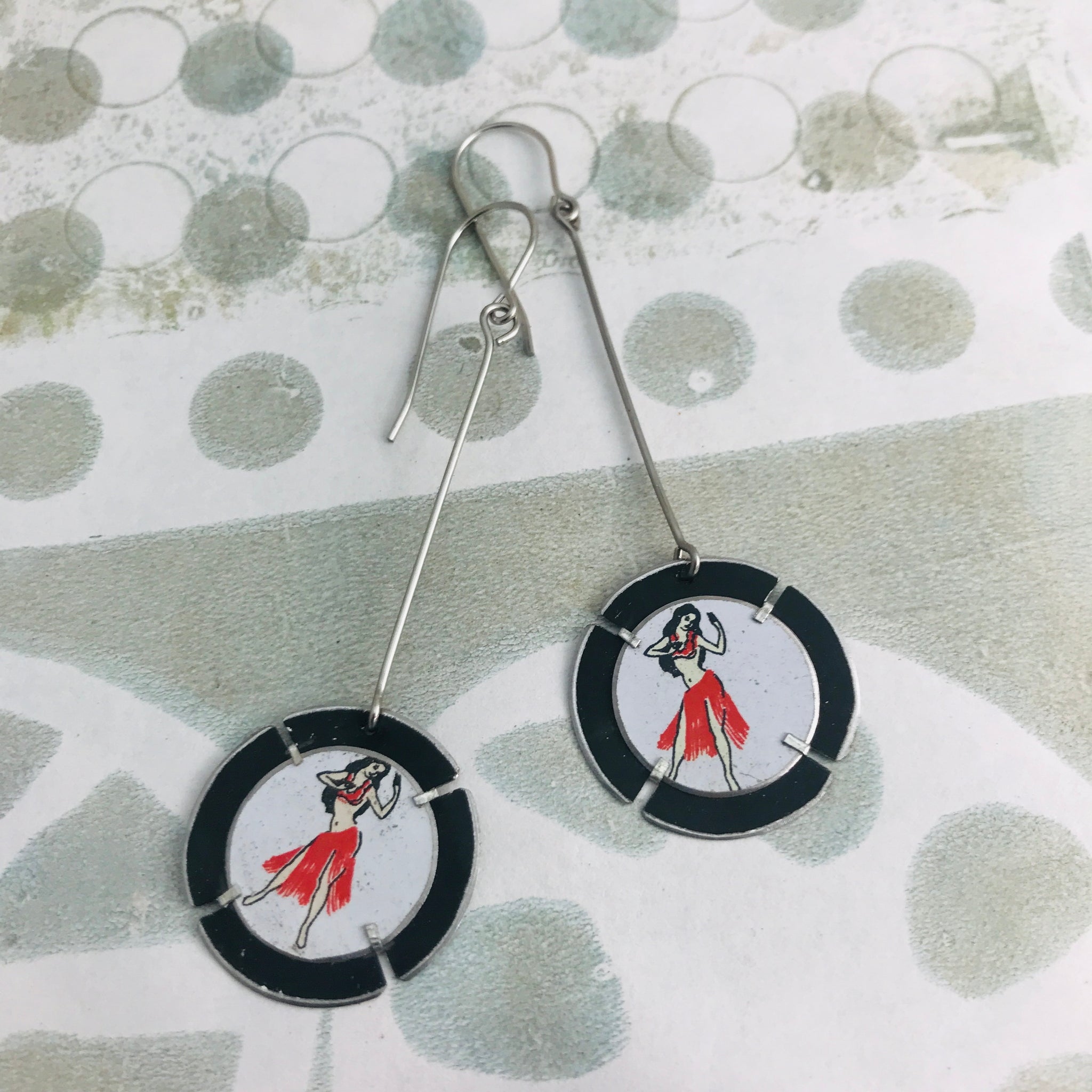 These hula dancers are cut from bottle caps. Here I’m playing around with a new design. The .75” wide white circles are each paired with a black circle of tin nearly an 1” (24mm) wide and married with tabs.