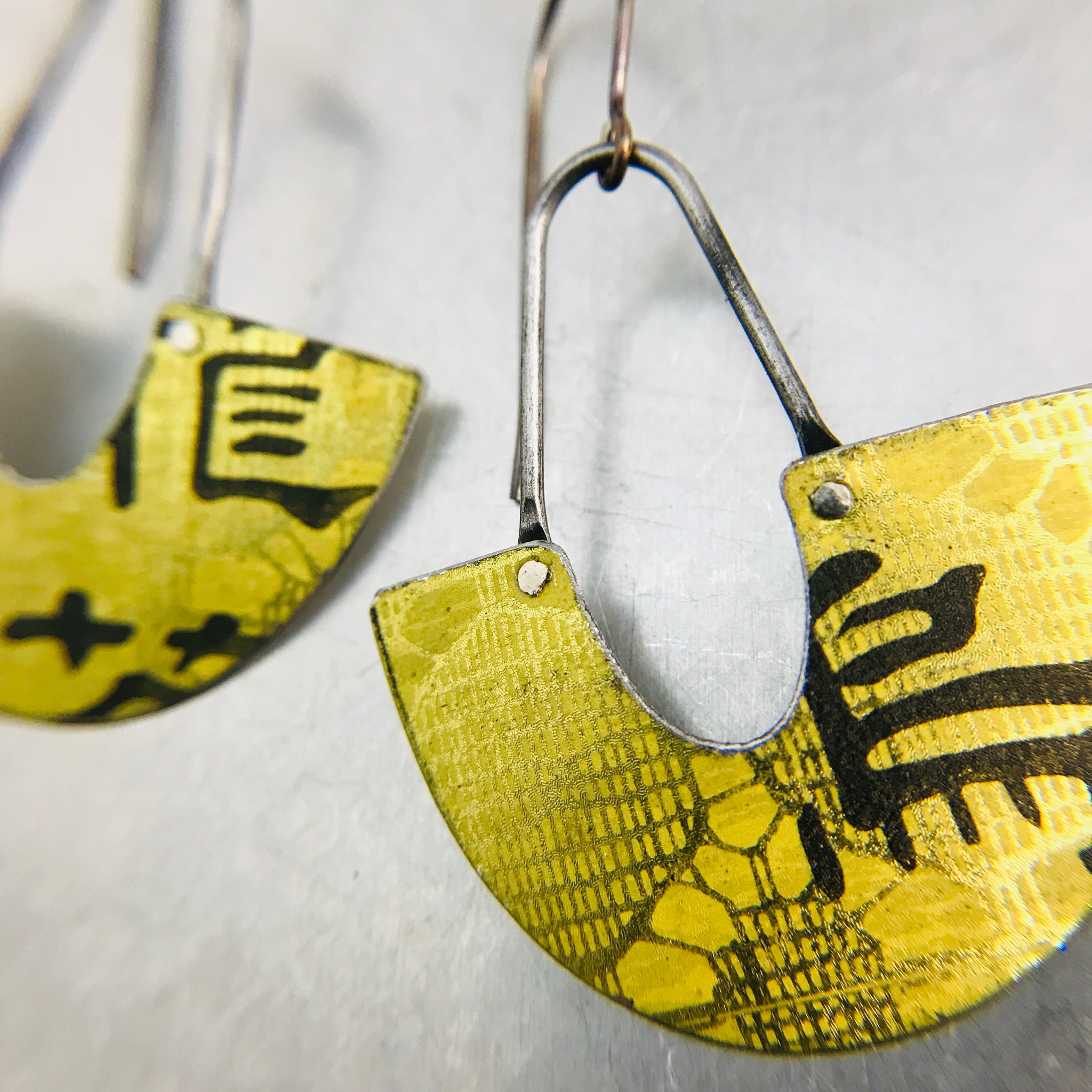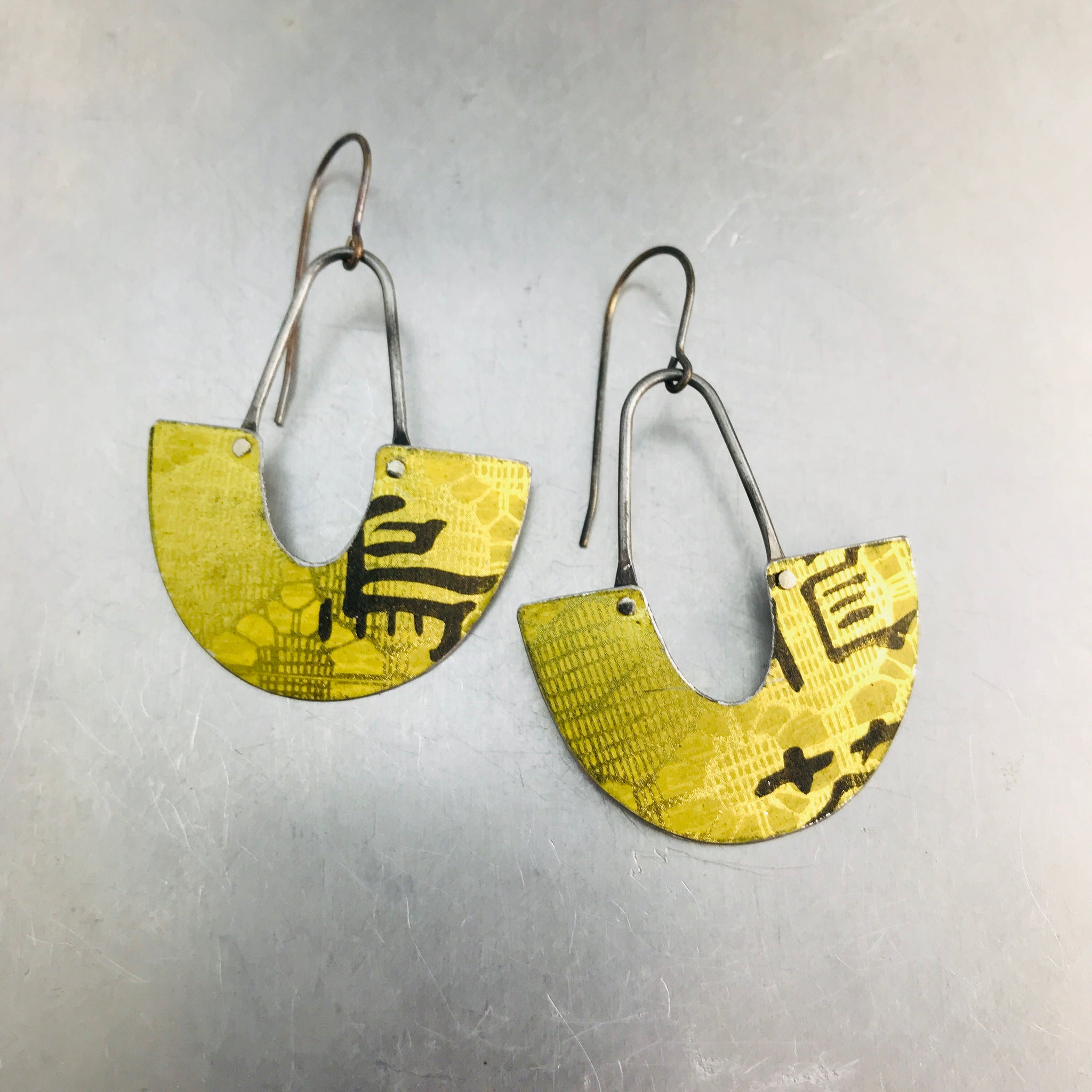 Each piece is hand cut, filed, finished smooth and then a riveted to an arc of waxed steel wire. A surgical stainless steel ear wire finishes the look.