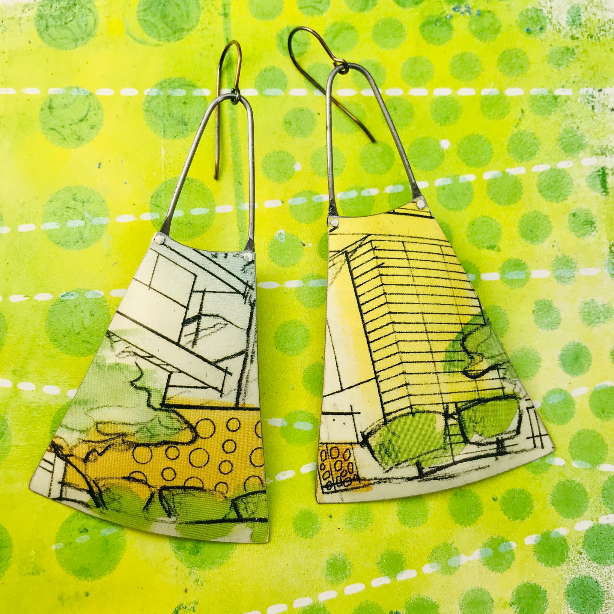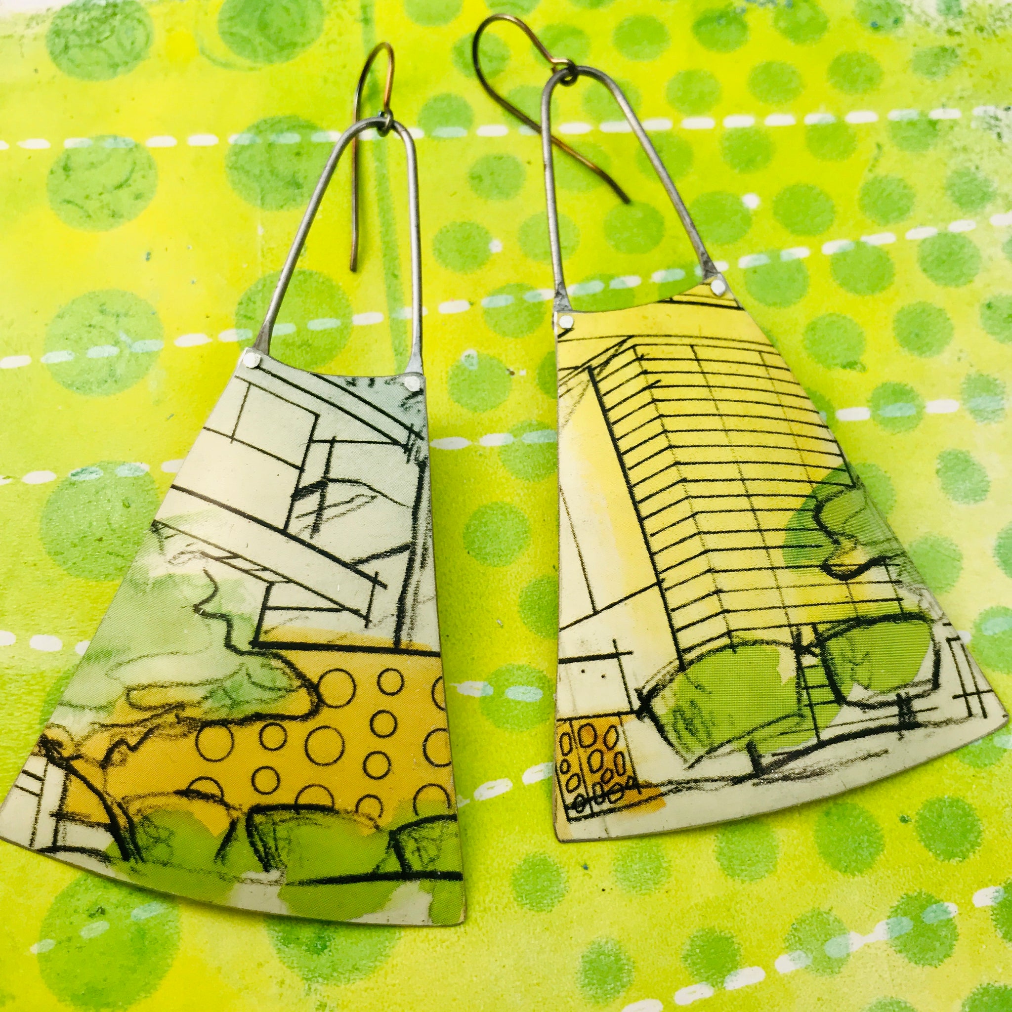 Each piece is hand cut, edges filed and finished smooth and then riveted to a length of waxed steel wire. A surgical stainless steel ear wire finishes the look.