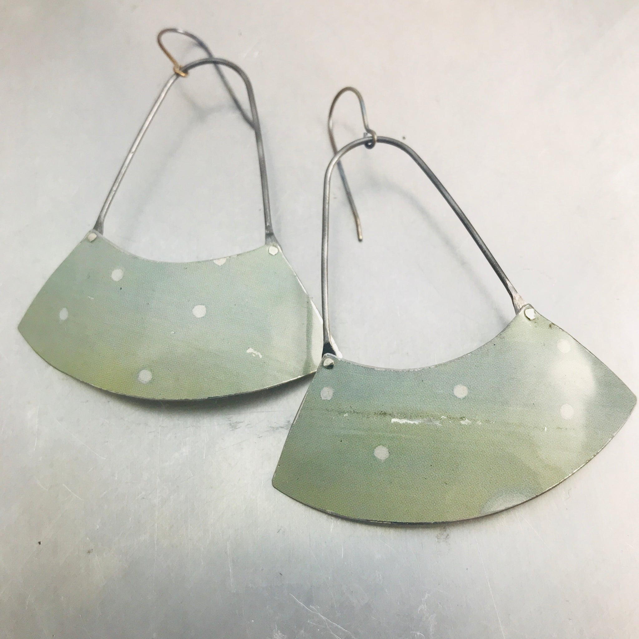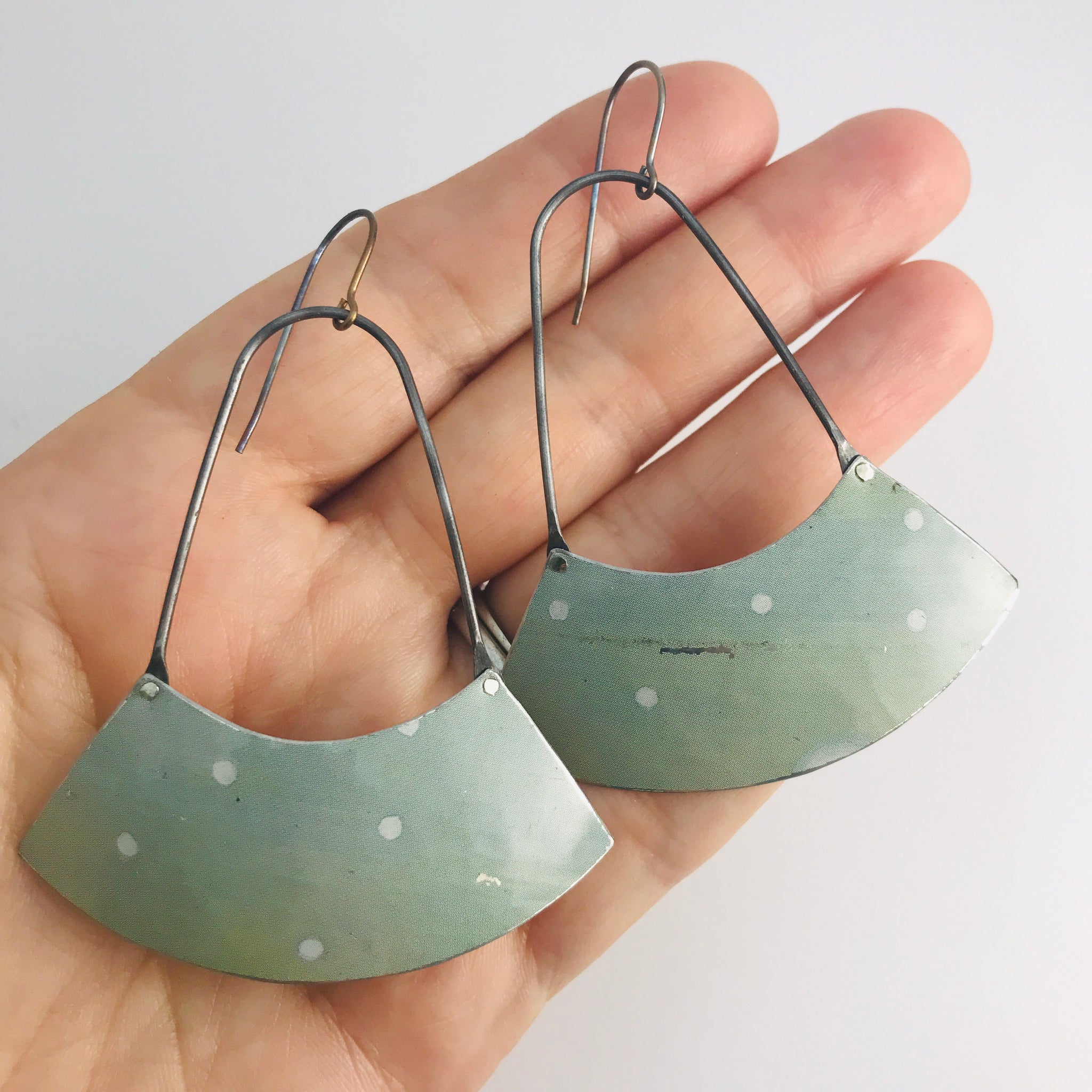 Each piece is hand cut, edges filed and finished smooth and then riveted to a length of waxed steel wire. A surgical stainless steel ear wire finishes the look.